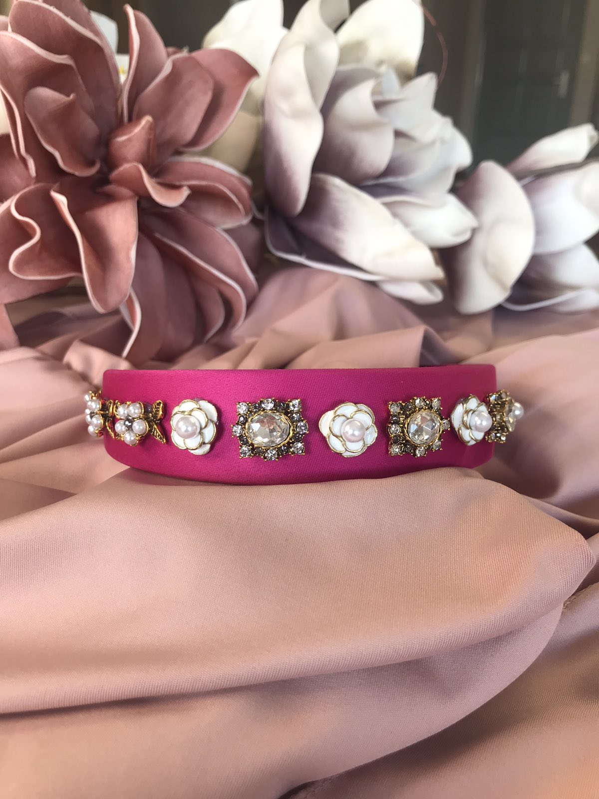 Στέκα μαλλιών σε φουξ απόχρωση με λευκά στρας και πέρλες σε σχήμα λουλουδιών.