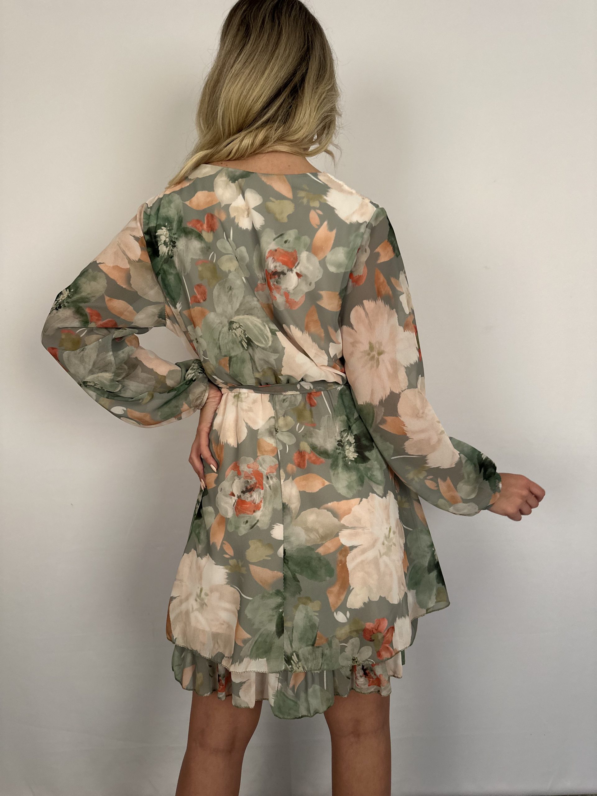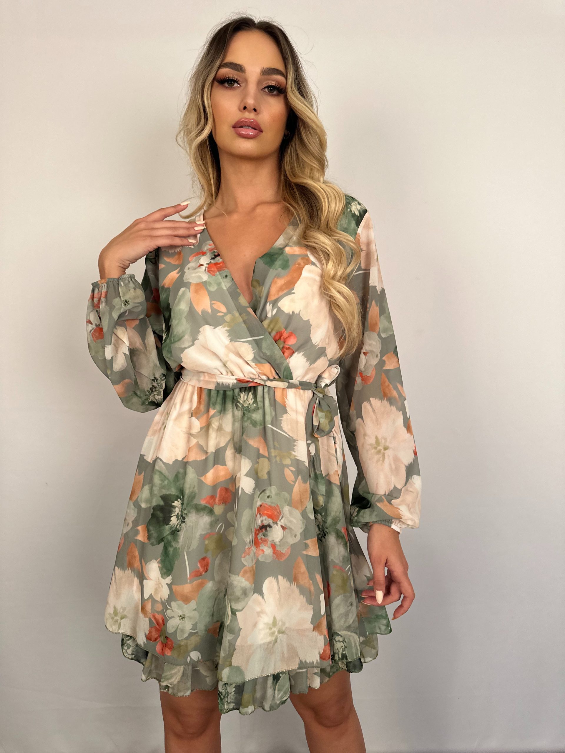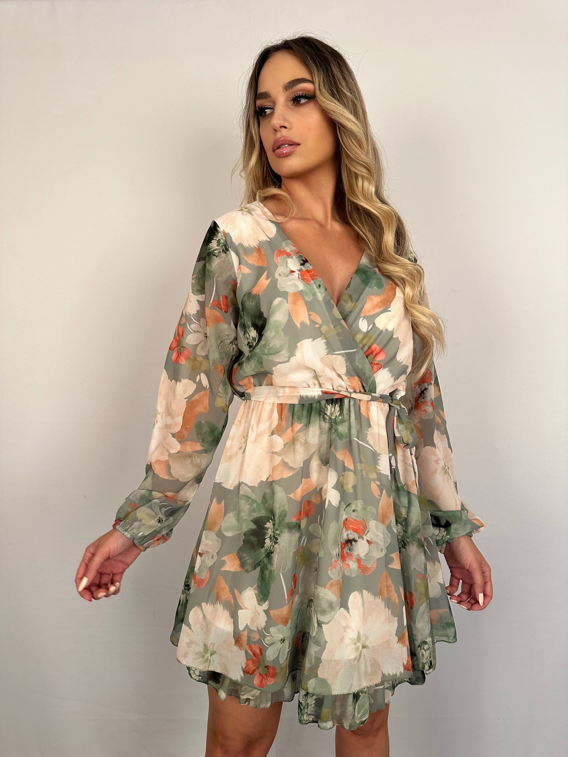 Φόρεμα mini φλοράλ,κρουαζέ, με μακρύ μανίκι με λάστιχο στο τελείωμα, λάστιχο στη μέση, διαθέτει ζωνάκι και μεσόφουστα εσωτερικά ώστε να μην διαφανίζει.