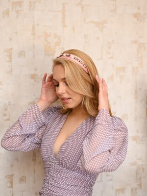 Φόρεμα mini, σε λιλά χρώμα, με μακρύ μανίκι, V στη στήθος και σούρα μπροστά και πίσω.