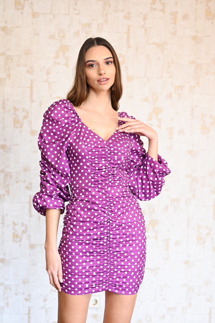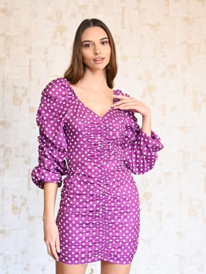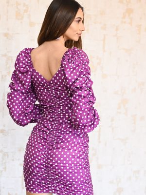 Φόρεμα mini, σε μωβ χρώμα, πουά, με μακρύ μανίκι, V στη στήθος και λάστιχο στους ώμους. Κλείνει με φερμουάρ στο πίσω μέρος.