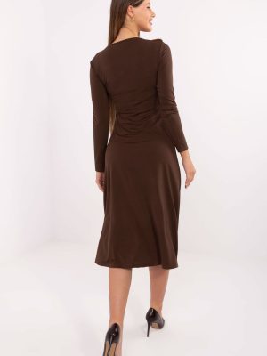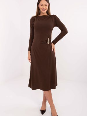 Κομψό midi φόρεμα, ιδανικό για διάφορες περιστάσεις από καθημερινές εξόδους, μέχρι στυλ για δουλειά, έως επισκέπτες συναντήσεις. Κατασκευασμένο από κυρίαρχο μείγμα πολυεστέρα και βισκόζης, προσφέρει άνεση στη χρήση, διαπνοή και ελαφριά εφαρμογή στο σώμα. Το μοντέλο ξεχωρίζει για το ομαλό, κλασικό σχέδιο που τονίζει τον διαχρονικό χαρακτήρα του φόρεματος. Ο λαιμός τύπου βάρκας δίνει συνοδευτικά κομψότητα, ενώ το μακρύ μανίκι κάνει το ρούχο κατάλληλο για κάθε εποχή. Μια ιδιαίτερη κομψότητα προσθέτουν τα μεταλλικά, διακοσμητικά στοιχεία που είναι τοποθετημένα στον δεξί ώμο και αριστερά στη μέση. Σε αυτά τα μέρη, το φόρεμα έχει τελειώσει και με απαλή συστροφή, που όμορφα μοντελοποιεί το σώμα και τραβά την προσοχή. Το φόρεμα δεν έχει κούμπωμα, καθιστώντας το βολικό στην τοποθέτηση και να προσαρμόζεται φυσικά στο σώμα. Είναι μια εξαιρετική πρόταση για γυναίκες που εκτιμούν την κλασική αισθητική με μια πινελιά σύγχρονων λεπτομερειών.