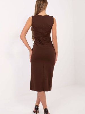 Το κομψό καθημερινό φόρεμα σε γραμμή μολυβιού είναι μια καθολική πρόταση για καθημερινή χρήση και για το γραφείο. Φτιαγμένο από συνδυασμό βισκόζης, νάιλον και ελαστάνης, προσφέρει άνεση στη φθορά, ελαστικότητα και κομψή προσαρμογή στη σιλουέτα. Το μοντέλο μήκους midi, χωρίς μανίκια, με στρογγυλή λαιμόκοψη και κρυφό φερμουάρ στο πίσω μέρος, εγγυάται άνεση και προσεγμένη ολοκλήρωση. Το φόρεμα διαθέτει ραμμένες τσέπες με καπάκι που προσθέτουν πρακτικότητα, ενώ οι διακοσμητικοί κομποί μπροστά εισάγουν μια διακριτική διακοσμητική πινελιά. Η λεπτή σχισμή μπροστά στο κάτω μέρος προσφέρει ελαφρότητα σε όλο το φόρεμα και διευκολύνει την ελευθερία κινήσεων, αναδεικνύοντας τη γυναικεία σιλουέτα με κομψό τρόπο.