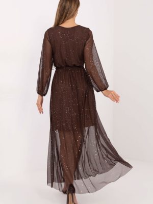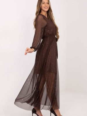 Η κομψή μακρυά φόρεμα από δίχτυ είναι μια μοναδική πρόταση για επίσημες περιστάσεις, ιδανική για γυναίκες που εκτιμούν τη λεπτή λάμψη και την ελαφρότητα. Κατασκευασμένο από μίγμα πολυεστέρα και βισκόζης, παρουσιάζεται εντυπωσιακά, ενώ παράλληλα προσφέρει άνεση κατά τη διάρκεια της φοράς χάρη στην μαλακή επένδυση. Το μοντέλο με αέρινη γραμμή αναδεικνύει όμορφα τις κινήσεις, δημιουργώντας μια γυναικεία και αέρινη σιλουέτα. Στην μέση υπάρχει ελαστική ταινία και ζώνη για δέσιμο που τονίζουν τη μέση και επιτρέπουν την προσαρμογή της εφαρμογής στις προσωπικές προτιμήσεις. Το μακρύ μανίκι από λεπτό δίχτυ, η στρογγυλή λαιμόκοψη και τα λαμπερά στοιχεία στο ύφασμα προσδίδουν στο φόρεμα έναν κομψό, βραδινό χαρακτήρα. Το μήκος maxi επισημαίνει επιπλέον το κομψό του στυλ. Με στυλ, γυναικεία και εξαιρετικά εντυπωσιακή, είναι ιδανική για πάρτι, τελετές και μοναδικές εξόδους.