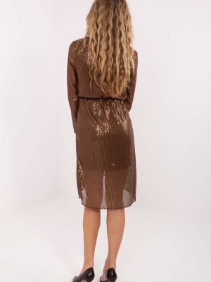 Μια κομψή φόρεμα με γραμμή τύπου περιτυλίγματος, του οποίου το κάτω μέρος έχει σχεδιαστεί επίσης σε μορφή περιτυλίγματος, υπογραμμίζοντας τη γυναικεία σιλουέτα και προσφέροντας ελαφρότητα και εξεζητημένο χαρακτήρα στο σύνολο. Το μοντέλο είναι ιδανικό για πάρτι και πιο επίσημες περιστάσεις. Το φόρεμα είναι κατασκευασμένο από μείγμα πολυεστέρα και ελαστάνης, το οποίο προσαρμόζεται καλά στο σώμα και εξασφαλίζει άνεση κατά τη διάρκεια της χρήσης. Η επιφάνειά του καλύπτεται πλήρως από λαμπερά παγιέτες που αντικατοπτρίζουν όμορφα το φως και προσελκύουν την προσοχή. Τα μακριά μανίκια και ο εντυπωσιακός περιτυλιγμένος λαιμός προσδίδουν στο φόρεμα κομψότητα και σέξι έκφραση. Το μοντέλο έχει μήκος μέχρι το γόνατο και η άνεση του αυξάνεται από το γεγονός ότι δεν διαθέτει κούμπωμα, διευκολύνοντας την τοποθέτησή του. Επιπλέον, διαθέτει επένδυση που αυξάνει την άνεση του φορέματος και εξασφαλίζει τέλεια τοποθέτηση του υφάσματος. Το φόρεμα έχει σχεδιαστεί για γυναίκες που θέλουν να εντυπωσιάσουν με τη λάμψη και την κομψότητά τους σε ιδιαίτερες περιστάσεις.