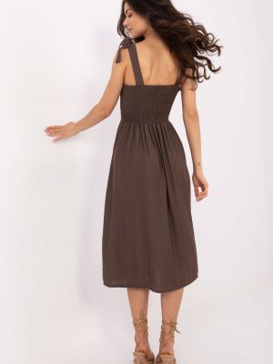 Αυτή η ελαφριά και κοριτσίστικη καλοκαιρινή φόρεμα είναι η ιδανική πρόταση για ζεστές, καθημερινές ημέρες. Κατασκευασμένη από αναπνεύσιμο μείγμα βισκόζης και νάιλον, προσφέρει άνεση κατά τη διάρκεια της χρήσης και απαλή ροή του υφάσματος. Έχει φαρδύ σχέδιο που αναδεικνύει όμορφα τη μέση και προσφέρει μια αίσθηση ελαφρότητας στην σιλουέτα. Οι ρυθμιζόμενοι ιμάντες επιτρέπουν την προσαρμογή του μήκους, ενώ η λαιμόκοψη σε σχήμα καρδιάς με διακριτική πτύχωση προσθέτει ρομαντική γοητεία στο όλο σύνολο. Στο πίσω μέρος, η φόρεμα είναι τελειωμένη με ελαστικές πτυχώσεις με λάστιχα, που προσαρμόζονται στην σιλουέτα, παρέχοντας άνεση και καλύτερη εφαρμογή. Η απουσία κλεισίματος καθιστά το μοντέλο εύκολο στην τοποθέτηση. Το μήκος μέχρι το γόνατο και το ομαλό σχέδιο κάνουν τη φόρεμα να είναι универсτική και ιδανική τόσο για βόλτες, αγορές, όσο και για καλοκαιρινές συναντήσεις με φίλους.