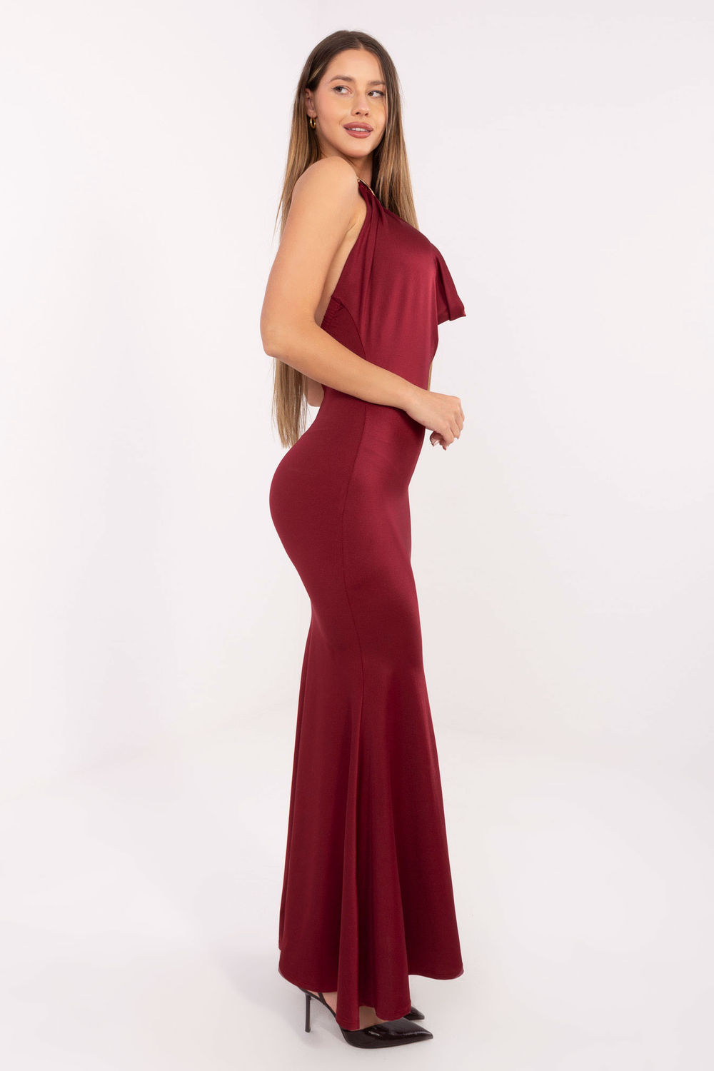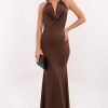 Μια κομψή maxi φόρεμα με αισθησιακή γραμμή γοργόνας, τέλεια για επισκέψεις και εκδηλώσεις όπου η κομψότητα και η εντυπωσιακή εμφάνιση έχουν σημασία. Φτιαγμένο από κυρίαρχο μίγμα πολυεστέρα και βισκόζης, αγκαλιάζει διακριτικά τη σιλουέτα, τονίζοντας τις καμπύλες και προσφέροντας ταυτόχρονα άνεση κατά τη φορεσιά. Το μοντέλο εντυπωσιάζει με το λείο, μινιμαλιστικό σχέδιο, το οποίο προσδίδει στην δημιουργία κλάση και διαχρονικό χαρακτήρα. Το φόρεμα είναι χωρίς μανίκια και προσελκύει την προσοχή με τον βαθύ, ρέοντα ντεκολτέ, που δημιουργεί μια κομψή γραμμή και εκθέτει απαλά τους ώμους. Ένα ιδιαίτερο στοιχείο είναι η στερέωση του φορέματος στον λαιμό με μεταλλικό κρίκο, που διαδραματίζει τόσο διακοσμητικό όσο και πρακτικό ρόλο. Η απουσία παραδοσιακού κλεισίματος καθιστά το φόρεμα να φαίνεται εξαιρετικά ρευστό και μοντέρνο, ενώ η μορφή του παραμένει αδιάσπαστη από επιπλέον στοιχεία. Είναι η ιδανική επιλογή για γυναίκες που επιθυμούν να ξεχωρίσουν με κομψότητα συνδυασμένη με μια μοντέρνα και τολμηρή γραμμή.