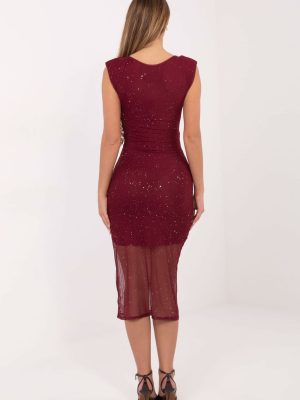 Αυτή η μοναδική φορεσιά cocktail εντυπωσιάζει με τον συνδυασμό λάμψης και κλασικής, σφιχτής σιλουέτας. Φτιαγμένη από υψηλής ποιότητας πολυέστερ και βισκόζη, κάθεται όμορφα πάνω στη σιλουέτα, τονίζοντας τις καμπύλες, ενώ το μήκος midi προσθέτει μια κομψότητα ιδανική για επισκέψεις και γιορτές. Ο λαιμός σε σχήμα V αποκαλύπτει απαλά τη γραμμή του λαιμού, ενώ οι διακοσμητικές μπροστά τοποθετημένες καρφίτσες προσθέτουν στην φορεσιά μια διακριτική λάμψη και εκλεπτυσμένο χαρακτήρα. Χάρη στην απουσία μανικιών, το μοντέλο φαίνεται ελαφρύ και μοντέρνο, ενώ οι ραμμένες μαξιλαροθήκες στους ώμους εξασφαλίζουν εντυπωσιακή, αρμονική γραμμή σιλουέτας. Το μπροστινό μέρος της δημιουργίας διακοσμείται με κομψές πτυχώσεις, οι οποίες όχι μόνο ποικιλόμορφες την εμφάνιση, αλλά και οπτικά σμιλεύουν την σιλουέτα. Η φορεσιά είναι εξοπλισμένη με επένδυση φτιαγμένη από μείγμα 95% βισκόζης και 5% ελαστάνης, εξασφαλίζοντας άνεση, κατάλληλη ελαστικότητα και ιδανική εφαρμογή στο σώμα. Το μοντέλο δεν διαθέτει κλείσιμο, γεγονός που το καθιστά πρακτικό και άνετο στην τοποθέτηση. Κομψή, αισθησιακή και γεμάτη λάμψη, ιδανική για μοναδικές περιστάσεις, όταν θέλεις να φαίνεσαι εντυπωσιακή.