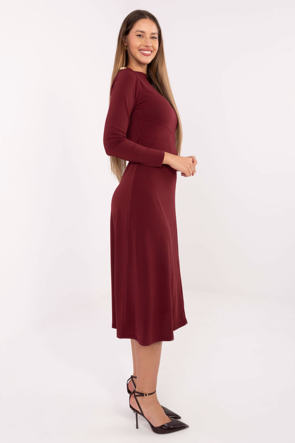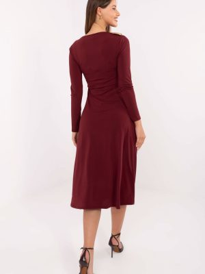 Μια κομψή μίντι φόρεμα, ιδανική για διάφορες περιστάσεις, από καθημερινές εξόδους, έως στυλιστικές επιλογές για τη δουλειά, μέχρι επισκέψεις. Κατασκευασμένη από κυρίαρχο μείγμα πολυεστέρα και βισκόζης, προσφέρει άνεση στη χρήση, αναπνοή και απαλή εφαρμογή στη σιλουέτα. Το μοντέλο διακρίνεται για το λείο, κλασικό σχέδιο, που υπογραμμίζει τον διαχρονικό χαρακτήρα της φόρεμα. Ο λαιμός τύπου μπάσου προσθέτει μια διακριτική εκλέπτυνση στο σύνολο, ενώ το μακρύ μανίκι εξασφαλίζει ότι η δημιουργία είναι εξαιρετική το κάθε εποχή του χρόνου. Μια ξεχωριστή κομψότητα προσθέτουν τα μεταλλικά, διακοσμητικά στοιχεία τοποθετημένα στον δεξί ώμο και στην αριστερή πλευρά της μέσης. Σε αυτά τα σημεία, η φόρεμα έχει τελειώσει και με απαλές τσάκισμα, που όμορφα διαμορφώνουν τη σιλουέτα και μαγνητίζουν τα βλέμματα. Η φόρεμα δεν διαθέτει κλείσιμο, γεγονός που την καθιστά άνετη στην τοποθέτηση και τοποθετείται φυσικά στο σώμα. Είναι μια εξαιρετική πρόταση για γυναίκες που εκτιμούν την κλασική κομψότητα με μια δόση σύγχρονων λεπτομερειών.