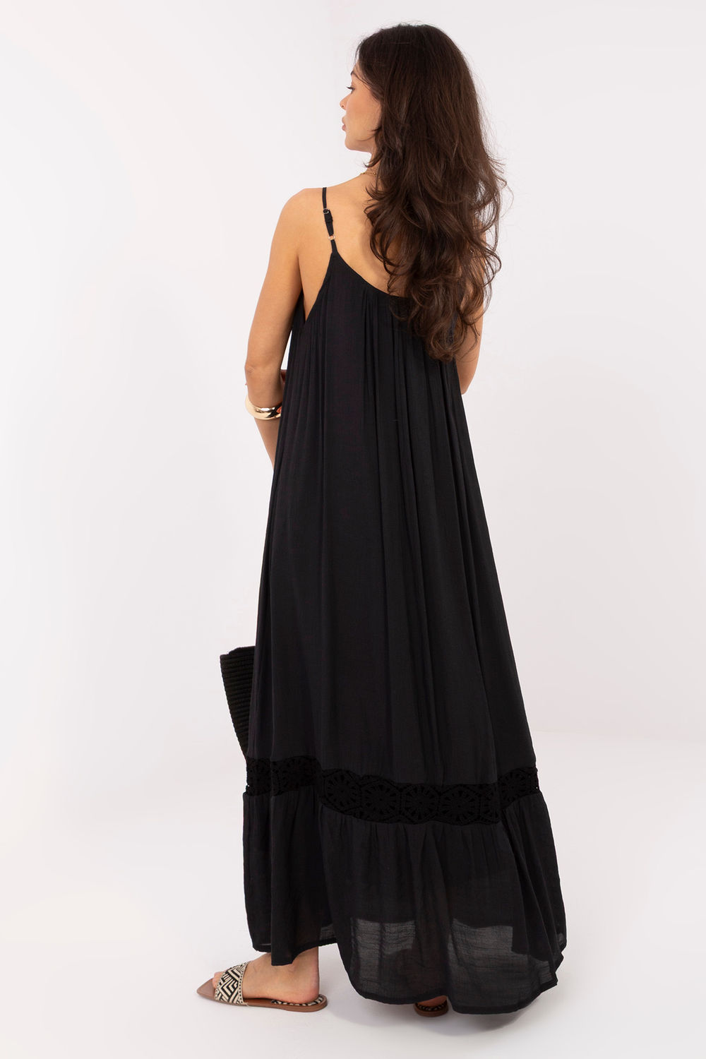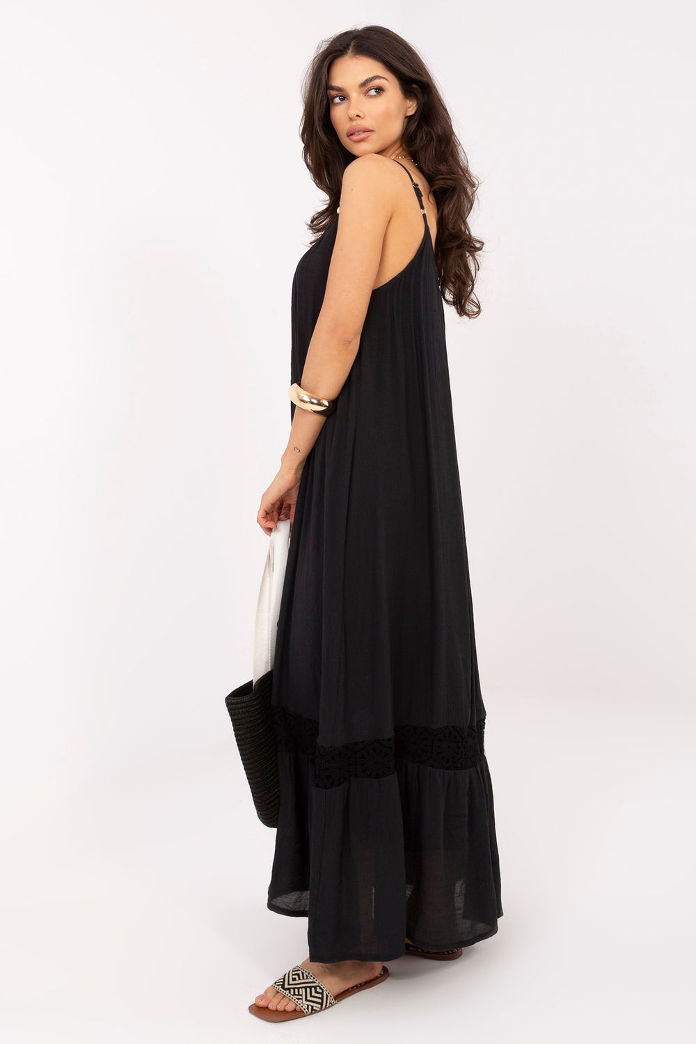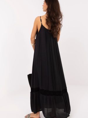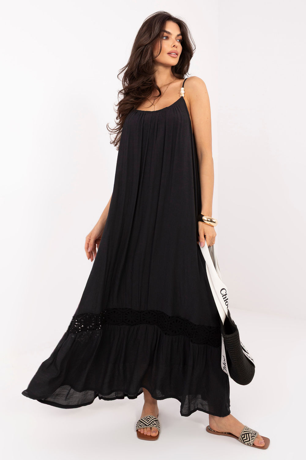 Η καλοκαιρινή φορεσιά σε στυλ μποέμ είναι μια ελαφριά και θηλυκή πρόταση, ιδανική για καθημερινές εμφανίσεις. Η χαλαρή της γραμμή προσφέρει άνεση κατά τη διάρκεια της χρήσης και έχει όμορφη κίνηση, τονίζοντας τον καλοκαίρι, τον ανεπίσημο χαρακτήρα της. Το μοντέλο maxi διατηρείται σε απλή αισθητική, συμπληρωμένο με μια λεπτή, αεράτη δαντελένια λεπτομέρεια στο κάτω μέρος, που προσθέτει στην όλη εμφάνιση μία αίσθηση ευαισθησίας και ρομαντικού φινιρίσματος. Ο στρογγυλός λαιμός και οι λεπτές ρυθμιζόμενες τιράντες εγγυώνται άνετη εφαρμογή στο σχήμα του σώματος. Ένα επιπλέον πλεονέκτημα είναι τα διακοσμητικά χάντρες στις τιράντες, που δίνουν στη φορεσιά έναν χαρακτηριστικό, μποέμ ψήφο και τονίζουν το καλοκαιρινό της στυλ. Η απουσία κλεισίματος καθιστά το μοντέλο πρακτικό και εύκολο στη χρήση. Κατασκευασμένη από μείγμα βαμβακιού και πολυεστέρα, η φορεσιά είναι αεράτη, ευχάριστη στην αφή και άνετη στη φορεσιά ακόμα και τις ζεστές ημέρες. Είναι η ιδανική επιλογή για το καλοκαίρι, περιπάτους και καθημερινές εξόδους με χαλαρό, κομψό στυλ.
