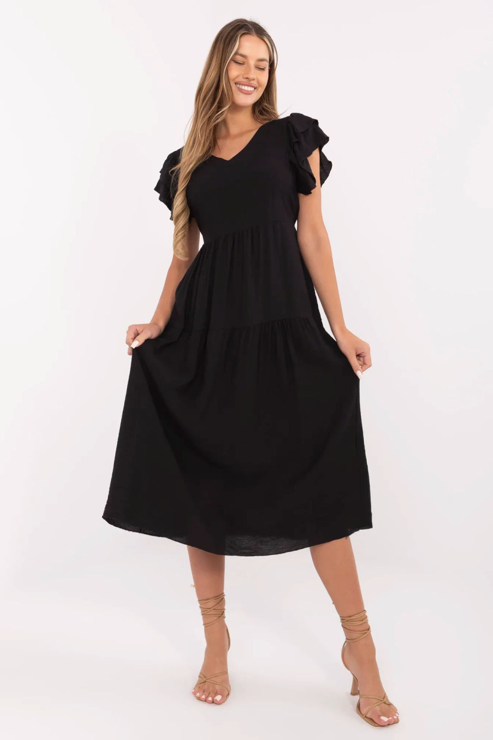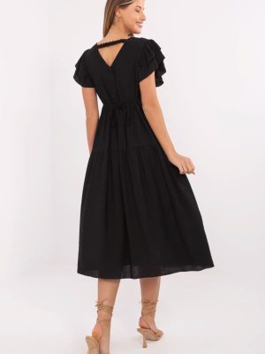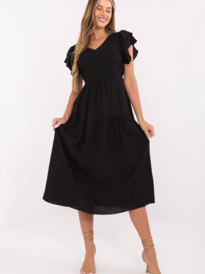 Μια κομψή και γυναικεία καλοκαιρινή φορεσιά με φαρδιά γραμμή είναι μια εξαιρετική πρόταση για καθημερινή χρήση και για τη δουλειά. Κατασκευασμένη από ελαφρύ και αεράτο μείγμα βισκόζης και ναίλον, προσφέρει άνεση ακόμη και τις πιο ζεστές μέρες. Το μοντέλο με μήκος μέχρι το γόνατο εφαρμόζει όμορφα στο σώμα, ενώ η ζώνη στη μέση επιτρέπει τη διακριτική ανάδειξη της μέσης. Το λείο υλικό δίνει στη φορεσιά έναν καθολικό, κομψό χαρακτήρα, διευκολύνοντας έτσι την προσαρμογή της σε διάφορες στυλιστικές επιλογές. Το κοντό μανίκι σε μορφή φουσκωτών λεπτομερειών προσθέτει ελαφρότητα και ρομαντική γοητεία, ενώ η ανοιχτή λαιμόκοψη σχηματίζει οπτικά μια κομψή γραμμή και προσθέτει γυναικεία χάρη. Η φορεσιά κλείνει με κουμπιά πίσω, που αποτελεί ένα στυλάτο στοιχείο και διευκολύνει τη διαδικασία φόρεσης. Είναι η ιδανική πρόταση για γυναίκες που εκτιμούν την άνεση, την κομψότητα και τη λειτουργικότητα, τόσο στην καθημερινή τους ζωή όσο και κατά τη διάρκεια πιο ήσυχων, καλοκαιρινών ημερών.
