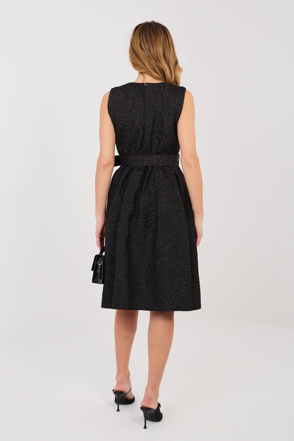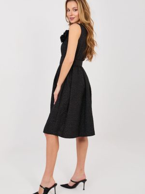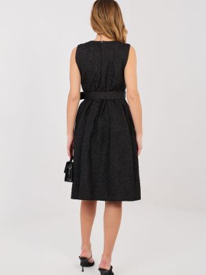 Μια κομψή φορεσιά για ειδικές περιστάσεις και στυλάτες εξόδους σε εκδηλώσεις. Η φούστα με κομψό στυλ αναδεικνύει όμορφα τη μέση και δίνει μια αίσθηση ελαφρότητας στη σιλουέτα, ενώ το μήκος πάνω από το γόνατο προσφέρει κλάση και διαχρονική κομψότητα. Το μοντέλο είναι κατασκευασμένο από υψηλής ποιότητας μείγμα πολυεστέρα και βισκόζης, που εξασφαλίζει άνεση φορέματος και τέλεια εφαρμογή του υφάσματος. Η ποικιλία της υφής του υφάσματος δίνει σε όλη την εμφάνιση έναν πρωτότυπο χαρακτήρα και μια υπολογισμένη βάθος. Η αμάνικη φορεσιά με κλασικό στρογγυλό κόψιμο παρουσιάζεται εξαιρετικά σικ. Με τη μέση επισημασμένη, και τις διακοσμητικές πτυχές, σμιλεύει όμορφα τη σιλουέτα και τονίζει τις γυναικείες καμπύλες. Στη συλλογή περιλαμβάνεται μια ζώνη με κούμπωμα, που επισημαίνει περαιτέρω τη μέση, και ένα αποσπώμενο μπροσάκι σε σχήμα λουλουδιού, που επιτρέπει την προσαρμογή του στυλ ανάλογα με την περίσταση. Είναι εξαιρετική επιλογή για πάρτι, οικογενειακές γιορτές και κομψές συναντήσεις, όταν θέλεις να φαίνεσαι ξεχωριστή και κομψή.