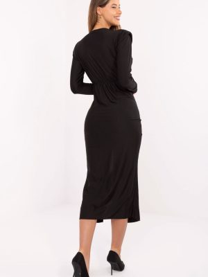 Φόρεμα βραδινό σε εφαρμοστή γραμμή, που αναδεικνύει τη γυναικεία σιλουέτα και συνδυάζει την κομψότητα με τη σύγχρονη αίσθηση. Κατασκευασμένο από υψηλής ποιότητας βισκόζη με προσθήκη πολυεστέρα, παρουσιάζεται εξαιρετικά κομψά και ταυτόχρονα εγγυάται άνεση κατά τη διάρκεια της χρήσης. Το λείο ύφασμα απλώνεται όμορφα στο σώμα, ενώ το μήκος midi προσθέτει στην εμφάνιση κλάση. Το μοντέλο διακρίνεται από ενσωματωμένα μαξιλάρια στους ώμους, που δίνουν στη σιλουέτα έντονες αναλογίες. Ο ζώνος ντεκολτέ εκθέτει διακριτικά τη γραμμή του λαιμού και του ντεκολτέ, ενώ οι πτυχώσεις μπροστά με την διακοσμητική μεταλλική αγκράφα τραβούν την προσοχή και αναδεικνύουν τη μέση. Το φόρεμα δεν διαθέτει κλείσιμο, που εξασφαλίζει άνεση και ευκολία στη φόρεση. Ιδανικό για επίσημες περιστάσεις ή εκδηλώσεις, επιτρέπει τη δημιουργία μιας εμφάνισης που θα μαγέψει με την κομψότητα και τη γυναικεία χάρη.