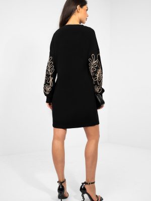 Φόρεμα φούτερ μήκους μίνι που συνδυάζει την άνεση με το γυναικείο στυλ. Κατασκευασμένο από ένα ιδιαίτερα ευχάριστο στην αφή ύφασμα τύπου βούτυρο, μαλακό, λεπτό και περιβάλλει το δέρμα. Το ύφασμα από βισκόζη με πρόσθετο ελαστάν προσφέρει εξαιρετική διαπνοή, ελαστικότητα και ιδανική προσαρμογή στη σιλουέτα. Το μοντέλο διαθέτει μακριά, φουσκωτά μανίκια που προσδίδουν συνολικά μια κομψή ελαφρότητα και μόδα. Η διακοσμητική κεντημένη λεπτομέρεια στα μανίκια αποτελεί μια εντυπωσιακή λεπτομέρεια που τραβά την προσοχή και υπογραμμίζει το μοναδικό στυλ του φορέματος. Ο κλασικός, στρογγυλός λαιμός εκθέτει όμορφα το λαιμό, ενώ η απουσία κλεισίματος καθιστά το μοντέλο εξαιρετικά άνετο και εύκολο στη φόρεση. Το φόρεμα διαθέτει πρακτικές τσέπες που είναι ενσωματωμένες στις πλευρικές ραφές, αυξάνοντας τη λειτουργικότητά του, χωρίς να διαταράσσουν τη γραμμή του στυλ. Το κυρίαρχο σχέδιο και οι καλοσχεδιασμένες λεπτομέρειες το καθιστούν ιδανική πρόταση τόσο για καθημερινές εμφανίσεις όσο και για συναντήσεις σε πιο casual στυλ.