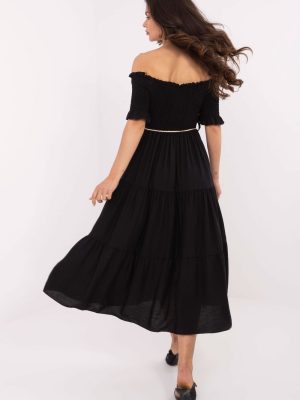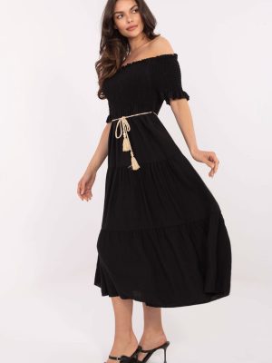 Το καλοκαιρινό midi φόρεμα με αέρινη γραμμή είναι εξαιρετική επιλογή τόσο για καθημερινές όσο και για επίσημες περιστάσεις. Κατασκευασμένο από ελαφρύ και αεριζόμενο μείγμα βισκόζης και νάιλον, διασφαλίζει άνεση κατά τη διάρκεια ζεστών ημερών. Ο λείος ύφασμα τονίζει την κομψότητα, ενώ ταυτόχρονα υπογραμμίζει τη λεπτότητα του φορέματος. Το πάνω μέρος είναι φινιρισμένο με ντεκολτέ τύπου καμπανού με ραφές και ελαστικές κορδόνες που αναδεικνύουν όμορφα τους ώμους και προσθέτουν θηλυκότητα στο σύνολο. Τα κοντά μανίκια που τελειώνουν με λουλούδια προσθέτουν ελαφρότητα και ρομαντική γοητεία. Το μοντέλο δεν διαθέτει κλείσιμο και φοριέται από το κεφάλι. Στη μέση υπάρχει μια ζώνη που επιτρέπει να τονίζεται η σιλουέτα και να προσαρμόζεται το φόρεμα στο σώμα. Ιδανικό για περιπάτους, καλοκαιρινές γιορτές ή συναντήσεις με αγαπημένα πρόσωπα.