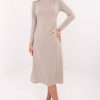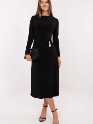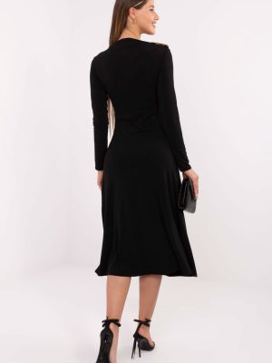 Κλασικό μίντι φόρεμα, ιδανικό για διάφορες περιστάσεις από καθημερινές εξόδους, μέχρι επαγγελματικά ντυσίματα και έως κοινωνικές συναντήσεις. Κατασκευασμένο από κυρίαρχο μείγμα πολυεστέρα και βισκόζης, εξασφαλίζει άνεση κατά τη διάρκεια της χρήσης, διαπερατότητα και ελαφριά προσαρμογή στη σιλουέτα. Το μοντέλο διακρίνεται για το ομαλό, κλασικό σχέδιο που αναδεικνύει τον διαχρονικό χαρακτήρα του φόρεματος. Ο κοψίματος τύπου «βάρκα» προσφέρει μια διακριτική κομψότητα, ενώ το μακρύ μανίκι καθιστά τη δημιουργία ιδανική για κάθε εποχή του χρόνου. Μια επιπλέον κομψότητα προσθέτουν τα μεταλλικά, διακοσμητικά στοιχεία που βρίσκονται στο δεξί ώμο και στην αριστερή πλευρά της μέσης. Σε αυτές τις περιοχές το φόρεμα έχει επίσης ολοκληρωθεί με λεπτές πτυχώσεις που όμορφα διαμορφώνουν τη σιλουέτα και προσελκύουν τα βλέμματα. Το φόρεμα δεν διαθέτει κούμπωμα, διευκολύνοντας τη φόρεση του και προσαρμόζεται φυσικά στο σώμα. Πρόκειται για μια εξαιρετική πρόταση για γυναίκες που εκτιμούν την κλασική κομψότητα με μια πινελιά σύγχρονων λεπτομερειών.