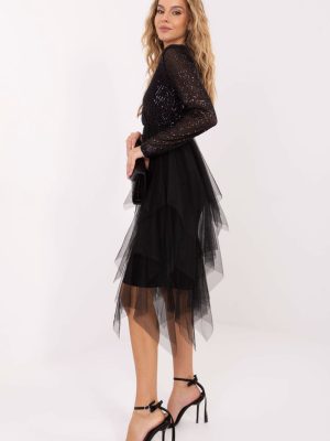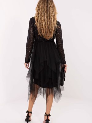 Ένα κομψό φουστάνι με φτερωτό σχέδιο, μήκους κάτω από το γόνατο, δημιουργημένο για ιδιαίτερες, επίσημες περιστάσεις καθώς και στυλάτες εξόδους σε πάρτι. Κατασκευασμένο από μείγμα πολυεστέρα και ελαστάνης, προσφέρει άνεση στη φόρμα και ιδανική εφαρμογή στο σώμα. Το επάνω μέρος του φορέματος εντυπωσιάζει με εντυπωσιακά στρας που λαμπυρίζουν όμορφα και προσθέτουν κομψότητα σε όλη την εμφάνιση. Ο περιμετρικός λαιμός αναδεικνύει τη γυναικεία γραμμή του λαιμού και προσδίδει στο σχέδιο έναν αισθησιακό, κομψό χαρακτήρα. Το μακρύ μανίκι προσθέτει διαχρονική κομψότητα και λεπτότητα. Η φούστα από τούλι προσφέρει ελαφρότητα και ρομαντικό αποτέλεσμα, καθώς χορεύει όμορφα στην κίνηση. Το μοντέλο διαθέτει φόδρα, που αυξάνει την άνεση και φροντίζει για την τέλεια εφαρμογή του υφάσματος. Το φόρεμα δεν έχει κλείσιμο, γεγονός που εξασφαλίζει άνεση και ροή στη μορφή. Είναι μια μοναδική πρόταση για γυναίκες που επιθυμούν να συνδυάσουν την κομψότητα, τη λάμψη και την ελαφρότητα σε μία, εντυπωσιακή εμφάνιση.