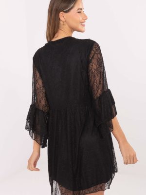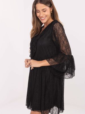 Εντυπωσιακό φόρεμα δαντελένιο με φαρδιά γραμμή είναι μια πρόταση που θα τονίσει τη γυναικεία φύση και θα προσθέσει γοητεία σε κάθε εμφάνιση. Κατασκευασμένο από λεπτή δαντέλα με ανοιχτό σχέδιο, συνδυασμένο με νάιλον και ελαστάνη, το φόρεμα που αγκαλιάζει όμορφα τη σιλουέτα και εγγυάται άνεση κατά τη διάρκεια της χρήσης. Το μοντέλο διαθέτει φόδρα που εξασφαλίζει άνεση και κομψή φινέτσα. Ο λαιμός σε σχήμα V με δέσιμο εκθέτει διακριτικά το λαιμό, ενώ η φρου φρου μπροστά και τα μανίκια 3/4 με φράουλες προσθέτουν ρομαντικό και στυλάτο χαρακτήρα. Το φόρεμα μήκους μίνι είναι ιδανικό για πάρτι, δεξιώσεις, Πρωτοχρονιά ή άλλες επίσημες περιστάσεις, δημιουργώντας μια εκπληκτική και γεμάτη χάρη εμφάνιση.