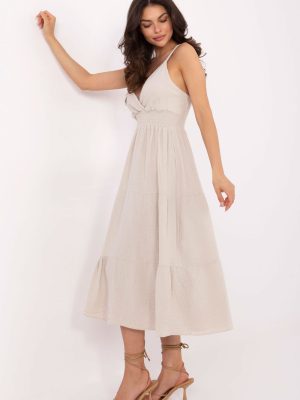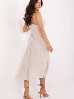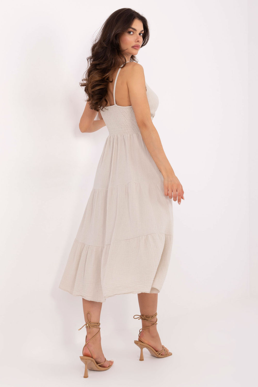 Το καλοκαιρινό μίντι φόρεμα από μουσελίνα με τιράντες είναι η ιδανική πρόταση για καθημερινές, άνετες στυλιστικές επιλογές. Κατασκευασμένο από μαλακό και αεριζόμενο βαμβάκι, είναι ιδανικό για ζεστές μέρες, προσφέροντας ελαφρότητα και άνεση. Η φούστα σε Α γραμμή δένει όμορφα στη σιλουέτα, ενώ ο απλός ύφασμα αναδεικνύει το φυσικό, μινιμαλιστικό στυλ. Ο κόψιμο σε φάκελο αποκαλύπτει διακριτικά το ντεκολτέ και προσθέτει θηλυκή γοητεία. Το φόρεμα δεν διαθέτει κούμπωμα, φοριέται από το κεφάλι και τα ελαστικά σήματα κάτω από το στήθος και στην πλάτη εξασφαλίζουν ιδανική εφαρμογή στη σιλουέτα. Μια επιπλέον βολάν στο κάτω μέρος προσθέτει στο φόρεμα ρομαντικό και κοριτσίστικο χαρακτήρα. Ιδανικό για βόλτα, συνάντηση με φίλους ή καλοκαιρινή μέρα στην πόλη.