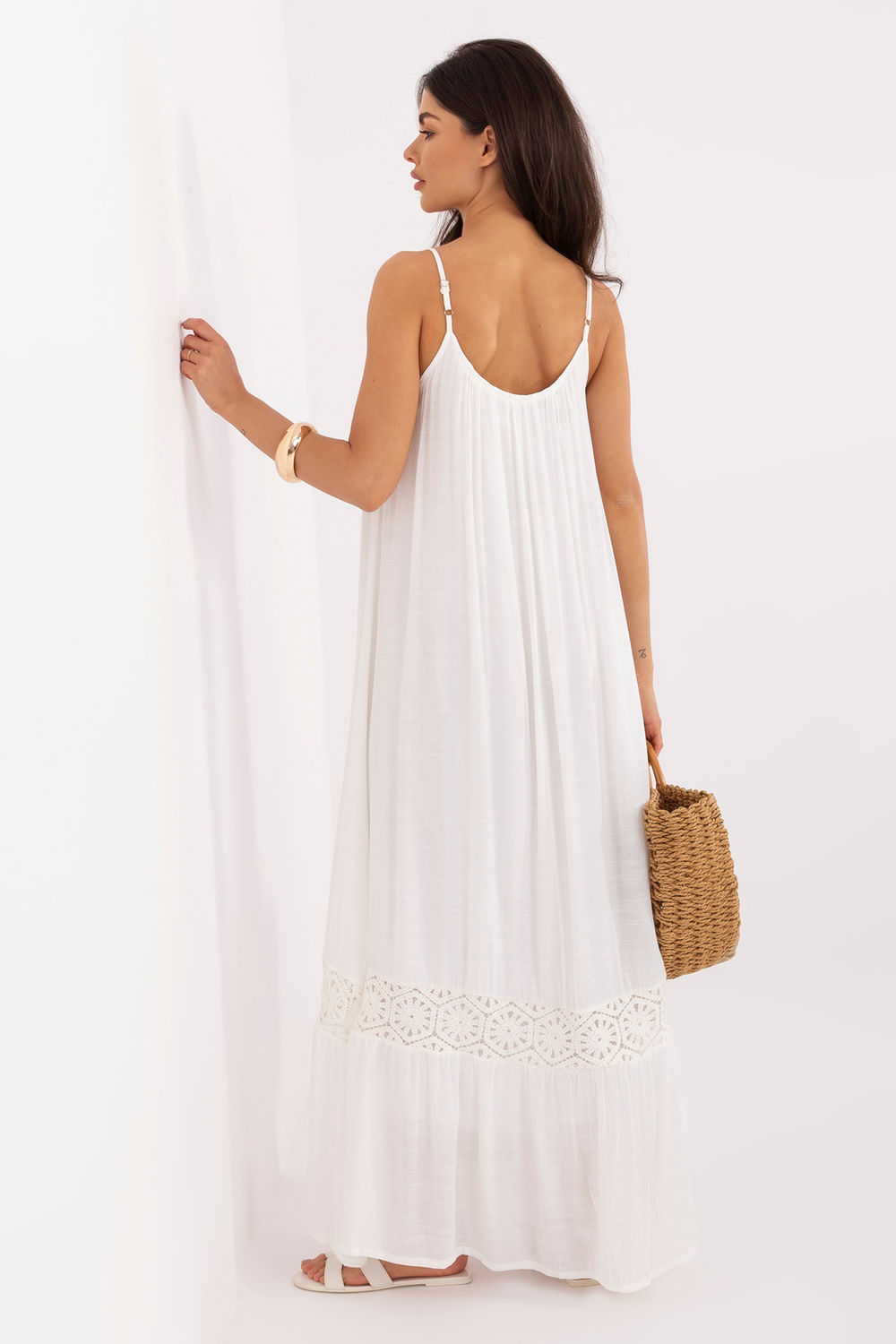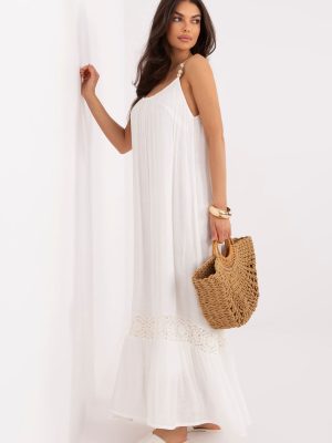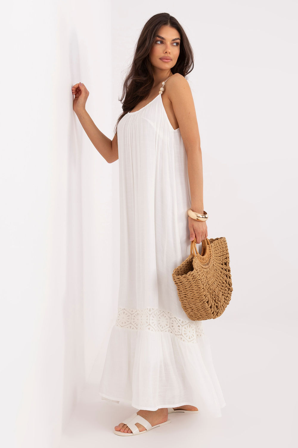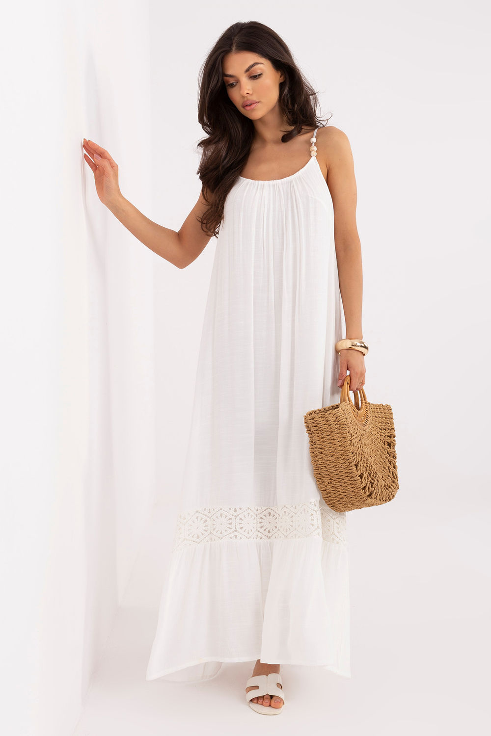 Το καλοκαιρινό φόρεμα σε στυλ boho είναι μια ελαφριά και γυναικεία πρόταση ιδανική για καθημερινές στυλιστικές επιλογές. Η άνετη γραμμή του εξασφαλίζει άνεση στη φόρμα και αποδίδει όμορφα στην κίνηση, υπογραμμίζοντας τον καλοκαιρινό, ανεπίσημο χαρακτήρα. Το μοντέλο maxi διατηρείται σε ομαλή αισθητική, συμπληρωμένη με μια διακριτική, αεριζόμενη λεπτομέρεια στο κάτω μέρος, η οποία προσθέτει λεπτότητα και ρομαντική φινέτσα στο σύνολο. Ο στρογγυλός λαιμός και οι λεπτές ρυθμιζόμενες τιράντες διασφαλίζουν άνετη εφαρμογή στο σώμα. Ένα επιπλέον πλεονέκτημα είναι οι διακοσμητικές χάντρες στις τιράντες, που προσδίδουν στο φόρεμα έναν χαρακτηριστικό boho τόνο και υπογραμμίζουν το καλοκαιρινό του στυλ. Η απουσία κλεισίματος καθιστά το μοντέλο πρακτικό και εύκολο στη χρήση. Κατασκευασμένο από μείγμα βαμβακιού και πολυεστέρα, το φόρεμα είναι αεράτο, ευχάριστο στην αίσθηση και άνετο στη φθορά, ακόμη και τις ζεστές ημέρες. Είναι η ιδανική επιλογή για το καλοκαίρι, τις βόλτες και τις καθημερινές εξόδους σε χαλαρό, στυλάτο ύφος.