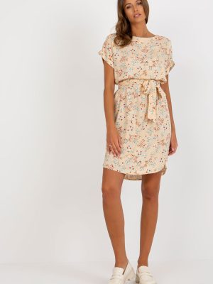 Καλοκαιρινό φόρεμα με κοντά μανίκια και στρογγυλή λαιμόκοψη. Ζώνη με δέσιμο στη μέση. Φόρεμα από ύφασμα με ενδιαφέρον φλοράλ μοτίβο.
