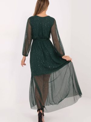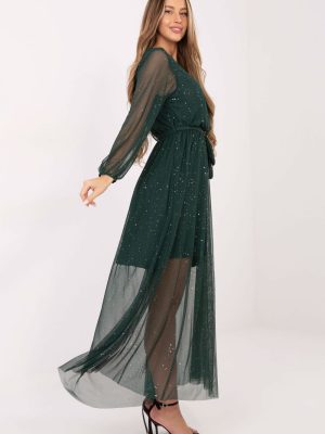 Η κομψή maxi φόρεμα από δίχτυ είναι μια μοναδική πρόταση για επίσημες περιστάσεις, ιδανική για γυναίκες που εκτιμούν την υποστηρικτική λάμψη και την ελαφρότητα. Φτιαγμένο από ένα μείγμα πολυεστέρα και βισκόζης, δείχνει εντυπωσιακό και ταυτόχρονα παρέχει άνεση κατά τη διάρκεια της χρήσης χάρη στη μαλακή επένδυση. Το μοντέλο με την φαρδιά γραμμή αγκαλιάζει όμορφα κατά την κίνηση, δημιουργώντας μια γυναικεία και ανέμελη σιλουέτα. Στη μέση έχει ραμμένη λάστιχο και μια ζώνη για δέσιμο που τονίζει τη μέση και επιτρέπει την προσαρμογή της εφαρμογής σύμφωνα με τις προσωπικές προτιμήσεις. Το μακρύ μανίκι από απαλό δίχτυ, η στρογγυλή λαιμόκοψη και τα λαμπερά στοιχεία στο ύφασμα προσδίδουν στο φόρεμα έναν κομψό, βραδινό χαρακτήρα. Το maxi μήκος επιπλέον τονίζει το κομψό στυλ του. Στυλάτο, γυναικείο και εξαιρετικά εντυπωσιακό, ιδανικό για δεξιώσεις, εορτές και ιδιαίτερες εξόδους.