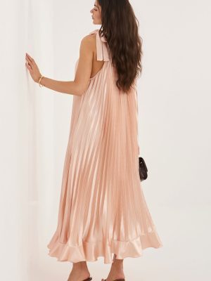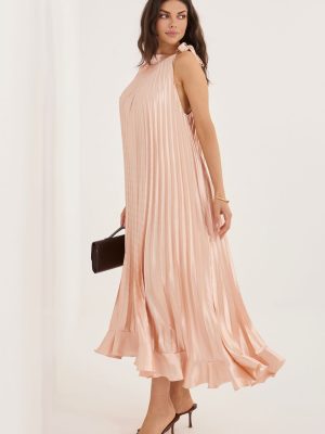 Η πλισέ φόρεμα cocktail είναι μια κομψή πρόταση που ταιριάζει τέλεια για ιδιαίτερες περιστάσεις και εκδηλώσεις. Το ελαφρύ, αέρινο στυλ του σε μήκος midi φαίνεται υπέροχο σε κίνηση, τονίζοντας τη γυναικεία σιλουέτα και προσθέτοντας μια υποtleνη ελαφρότητα στην εμφάνιση. Το μοντέλο χωρίς μανίκια με κλασική, στρογγυλή λαιμόκοψη παρουσιάζεται διαχρονικά και με στυλ. Ένα πρωτότυπο στοιχείο είναι η δέσμευση στον αριστερό ώμο, που δίνει στο φόρεμα έναν μοναδικό χαρακτήρα και προσελκύει την προσοχή. Το κάτω μέρος, που τελειώνει με μια λεπτή δαντέλα, προσθέτει ρομαντική γοητεία και ελαφρότητα στο σύνολο. Το λείο ύφασμα που είναι συνδυασμός πολυεστέρα, βισκόζης και ελαστάνης προσφέρει άνεση κατά τη διάρκεια της φθοράς, κατάλληλη εφαρμογή και ελευθερία κινήσεων. Είναι το ιδανικό φόρεμα για κοινωνικές εκδηλώσεις και πάρτι για γυναίκες που εκτιμούν την κομψότητα σε μοντέρνα έκδοση.