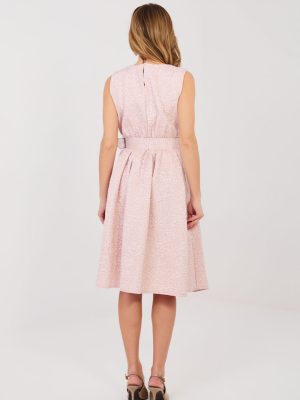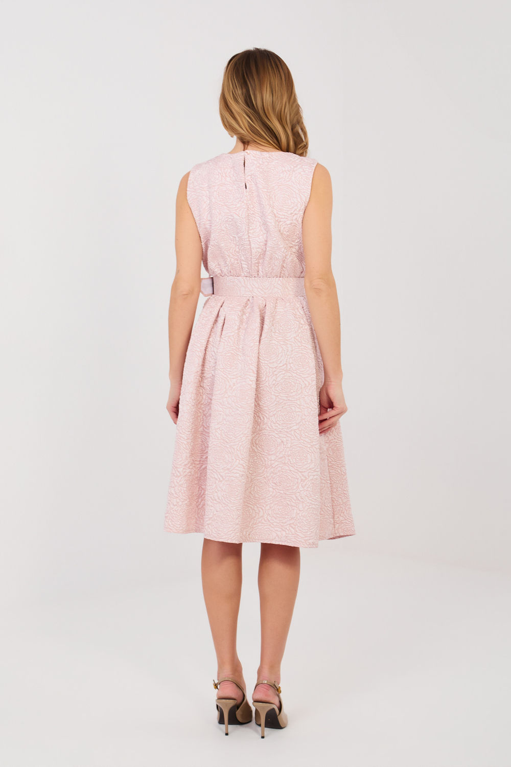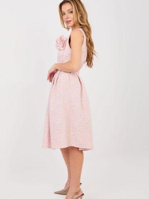 Μια κομψή φόρμα για ειδικές περιστάσεις και στυλάτα βραδινά γεύματα. Το φουσκωτό σχέδιο τονίζει όμορφα τη μέση και προσφέρει ελαφρότητα στη σιλουέτα, ενώ το μήκος κάτω από το γόνατο προσθέτει κλάση και διαχρονική κομψότητα. Το μοντέλο είναι κατασκευασμένο από υψηλής ποιότητας μείγμα πολυεστέρα και βισκόζης, το οποίο εξασφαλίζει άνεση στην ψυχρή περίοδο και τέλεια κατάσταση του υλικού. Η διαφοροποιημένη υφή του υφάσματος αποδίδει συνολικά έναν αυθεντικό χαρακτήρα και μια υποβλητική διάσταση. Η φόρμα έχει χωρίς μανίκια και κλασικό στρογγυλό λαιμόκοψι, και φαίνεται εξαιρετικά κομψή. Το σχέδιο που κόβεται στη μέση, με διακοσμητικά πτυχώσεις, διαμορφώνει όμορφα τη σιλουέτα και υπογραμμίζει τις θηλυκές καμπύλες. Στο σετ περιλαμβάνεται ζώνη που κουμπώνει, η οποία προσθέτει επιπλέον έμφαση στη μέση, καθώς και αποσπώμενη καρφίτσα σε σχήμα λουλουδιού, που επιτρέπει την προσαρμογή του στυλ ανάλογα με την περίσταση. Είναι τέλεια επιλογή για δεξιώσεις, οικογενειακές εκδηλώσεις και κομψές συναντήσεις, όταν θέλετε να δείχνετε μοναδικές και με στυλ.