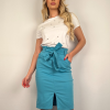 Φούστα midi ελαστική με λάστιxo στη μέση και σκίσιμο στο μπροστινό μέρος. Διαθέτει ζωνάκι ίδιου χρώματος & υφάσματος.