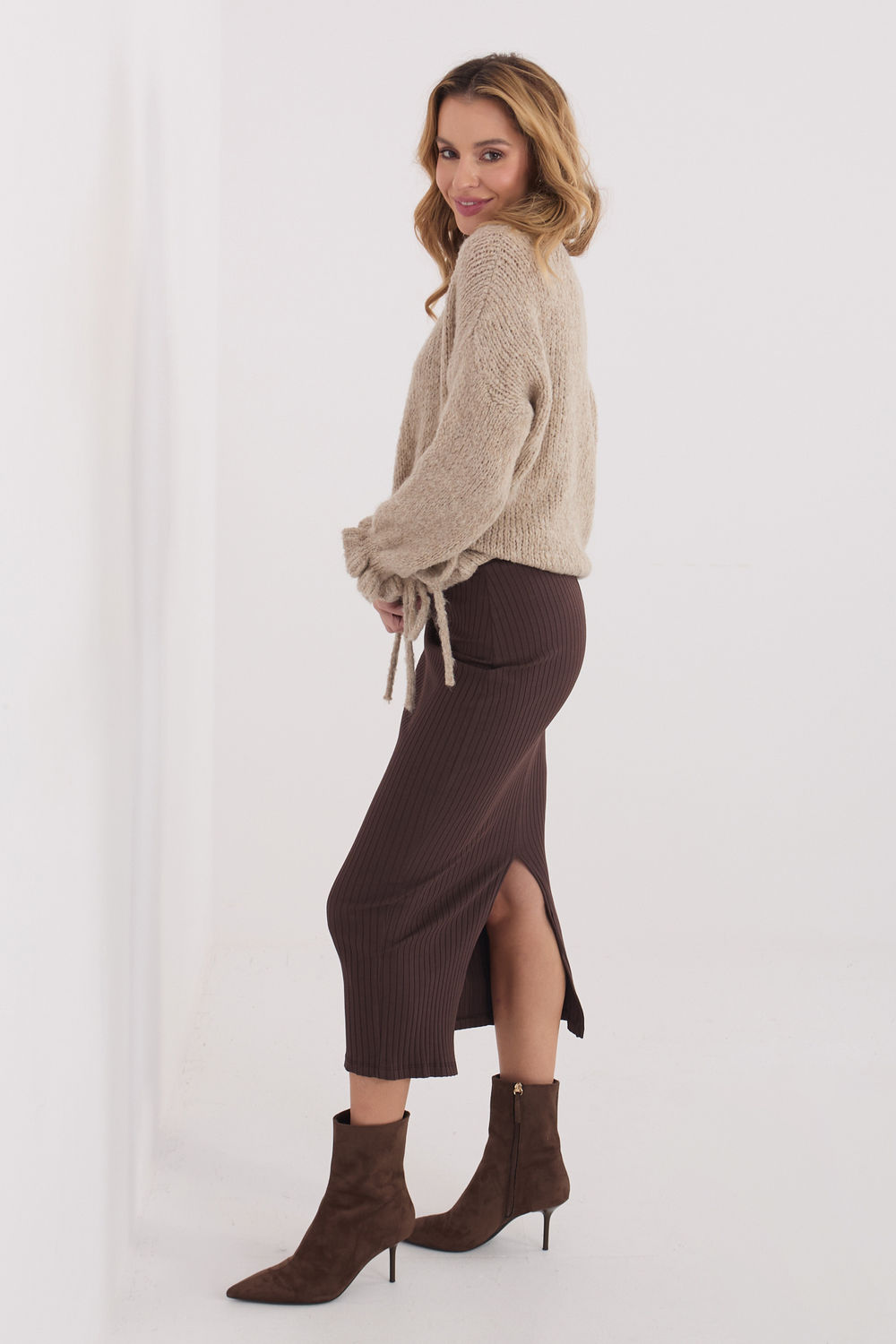 Φούστα από πλεκτό ύφασμα με μήκος μίντι, φτιαγμένη από μαλακό, ριγωτό υλικό που προσφέρει υψηλή άνεση κατά την χρήση. Το μοντέλο σε στυλ casual είναι ιδανικό τόσο για καθημερινές εμφανίσεις όσο και ως στοιχείο ενδυμασίας για το γραφείο. Το ομαλό σχέδιο της δίνει έναν καθολικό χαρακτήρα και διευκολύνει το συνδυασμό με διάφορες γραμμές μπλουζών ή πουλόβερ. Στο πίσω μέρος, στο κάτω μέρος, υπάρχει μια πρακτική σχισμή που τονίζει τη σιλουέτα και εξασφαλίζει ελευθερία κινήσεων. Η φούστα είναι ραμμένη από βαμβάκι με προσθήκη ελαστάνης, γεγονός που την καθιστά ευέλικτη, ευχάριστη στην αφή και την κάνει να προσαρμόζεται καλά στη σιλουέτα. Η απουσία κλεισίματος τονίζει τη απλή, άνετη μορφή του μοντέλου.