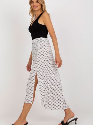 Ασύμμετρη φούστα από λευκό ύφασμα με μπλε πουά. Δύο διακοσμητικά σκισίματα μπροστά.