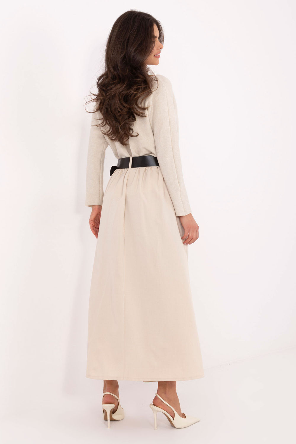 Μια κομψή και γυναικεία μακριά φούστα maxi με πτυχές μπροστά, που συνδυάζει την άνεση της φθοράς με κλασικό στυλ κατάλληλο τόσο για εργασία όσο και για καθημερινές εξόδους. Κατασκευασμένη από μείγμα υψηλής ποιότητας βισκόζης και πολυεστέρα, είναι ελαφριά, αεράτη και στέκεται όμορφα στο σώμα. Το μοντέλο διαθέτει ραμμένη ελαστική ζώνη στο πίσω μέρος, που εξασφαλίζει τέλεια εφαρμογή στη μέση, καθώς και μια κλεισμένη ζώνη που επιτρέπει μια διακριτική έμφαση στη σιλουέτα. Οι πλευρικές, όρθιες τσέπες προσθέτουν λειτουργικότητα, ενώ οι πτυχές μπροστά δίνουν στη φούστα μια κομψή, φαρδιά μορφή. Η φούστα έχει λείο σχέδιο, χωρίς κλασικό κλείσιμο και μήκος maxi, καθιστώντας την καθολική και εύκολη στην στυλιζαρίσματος. Είναι ιδανική πρόταση για καθημερινές, επίσημες και κομψές περιπτώσεις, συνδυάζοντας την άνεση με ένα διαχρονικό σχέδιο.