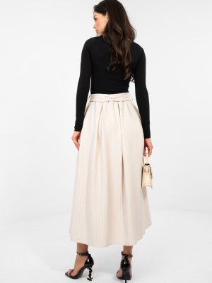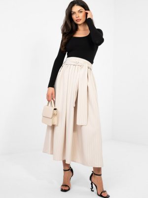 Η κομψή μίντι φούστα σε φαρδιά γραμμή είναι η τέλεια επιλογή για γυναίκες που εκτιμούν την κλασική αισθητική με μια μοντέρνα πινελιά. Το μοντέλο με τη ψηλή μέση τονίζει όμορφα τη σιλουέτα, ενώ η ενσωματωμένη ελαστική ζώνη στη μέση εξασφαλίζει τέλεια εφαρμογή και άνεση καθ’ όλη τη διάρκεια της ημέρας. Η φούστα είναι κατασκευασμένη από ριγέ ύφασμα, που της προσδίδει στυλ και την κάνει να φαίνεται πιο λεπτή. Περιλαμβάνει έναν πρόσθετο ζωνάκι που επιτρέπει να τονίσετε περισσότερο τη μέση και να προσδώσετε στην εμφάνιση σας προσωπικό χαρακτήρα. Οι πρακτικές τσέπες παρέχουν επιπλέον λειτουργικότητα στο μοντέλο. Κατασκευασμένη από μείγμα πολυεστέρα, βισκόζης και ελαστάνης, συνδυάζει ανθεκτικότητα με απαλότητα και ελαστικότητα, εξασφαλίζοντας άνεση και κομψή εμφάνιση τόσο σε επαγγελματικές όσο και σε ειδικές περιστάσεις.