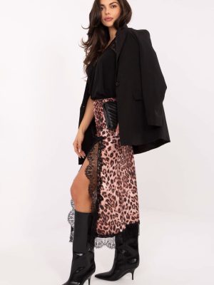 Η κομψή σατέν φούστα είναι μια στιλάτη πρόταση που ταιριάζει άψογα τόσο σε καθημερινές εμφανίσεις όσο και σε επίσημες περιστάσεις καθώς και στη δουλειά. Το εντυπωσιακό ζωικό μοτίβο της προσδίδει έντονο, μοντέρνο χαρακτήρα, υπογραμμίζοντας το ατομικό στυλ. Το μοντέλο διαθέτει ελαστική ζώνη στη μέση, που εξασφαλίζει άνεση κατά την χρήση και ιδανική εφαρμογή στη σιλουέτα. Η σχισμή στο μπροστινό μέρος φτάνει μέχρι τον μηρό και εκθέτει διακριτικά το πόδι, προσθέτοντας σε όλο το σύνολο θηλυκή ελαφρότητα και κομψότητα. Όλο το σχέδιο έχει ολοκληρωθεί με μια λεπτή δαντελένια περιθώριο, που αποτελεί μια ξεχωριστή, διακοσμητική λεπτομέρεια. Η φούστα είναι φτιαγμένη από υψηλής ποιότητας μείγμα πολυεστέρα, βισκόζης και ελαστάνης, γεγονός που καθιστά το υλικό ελαφρύ, ευχάριστο στην αφή και ελαφρώς ελαστικό. Η έλλειψη κλεισίματος αναδεικνύει τη μίνιμ ιστορική μορφή και την άνεση στη χρήση.