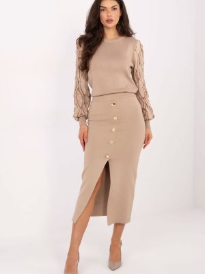 Κομψό πλεκτό φούστα με απλό σχέδιο, σχεδιασμένο για καθολική χρήση, ιδανικό για επισκεπτικές περιστάσεις, για τη δουλειά καθώς και για καθημερινές στυλιστικές επιλογές. Κατασκευασμένη από υψηλής ποιότητας μείγμα βισκόζης και πολυεστέρα, προσφέρει απαλότητα, άνεση και λεπτή ελαστικότητα. Το μοντέλο μήκους μίντι τοποθετείται όμορφα στο σώμα, ενώ η ελαστική ζώνη στη μέση εξασφαλίζει άνετη εφαρμογή και ελευθερία κινήσεων. Η φούστα δεν διαθέτει κούμπωμα, το οποίο αυξάνει περαιτέρω την άνεση κατά την εφαρμογή. Στο μπροστινό μέρος υπάρχουν διακοσμητικά κουμπιά που προσθέτουν έναν κομψό χαρακτήρα στο σύνολο. Ένα επιπλέον πλεονέκτημα είναι η σχισμή στο κάτω μέρος μπροστά, που υπογραμμίζει διακριτικά τη γραμμή των ποδιών και προσφέρει μεγαλύτερη ελευθερία κατά το βάδισμα. Είναι ένα στυλάτο και λειτουργικό μοντέλο για γυναίκες που εκτιμούν την κλασικότητα, την άνεση και την διαχρονική κομψότητα.