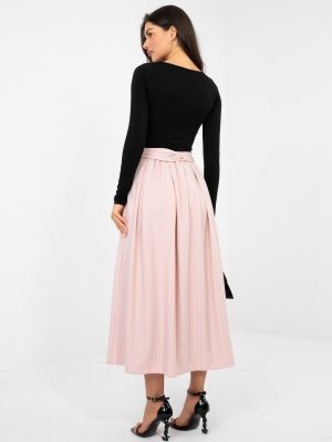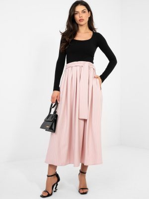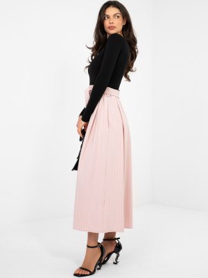 Η κομψή midi φούστα με φαρδιά γραμμή είναι μια εξαιρετική επιλογή για γυναίκες που εκτιμούν την κλασική αίσθηση με μια δόση μοντερνισμού. Το μοντέλο με τη ψηλή μέση αναδεικνύει υπέροχα τη μέση, ενώ η ελαστική μπάντα στη μέση εξασφαλίζει τέλεια εφαρμογή και άνεση κατά τη διάρκεια της ημέρας. Η φούστα είναι κατασκευασμένη από υλικό με ρίγες, που προσθέτει στυλ και οπτικά αδυνατίζει τη σιλουέτα. Στη συσκευασία περιλαμβάνεται μια πρόσθετη ζώνη για να δεθεί, επιτρέποντας μια ακόμη καλύτερη επισήμανση της μέσης και προσδίδοντας στη στυλιστική εμφάνιση μια ατομική έκφραση. Οι πρακτικές τσέπες προσθέτουν λειτουργικότητα στο μοντέλο. Φτιαγμένη από ένα μείγμα πολυεστέρα, βισκόζης και ελαστάνης, συνδυάζει αντοχή με απαλότητα και ευελιξία, εξασφαλίζοντας άνεση και κομψή εμφάνιση τόσο σε γραφειακές εμφανίσεις όσο και σε ιδιαίτερες περιστάσεις.