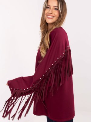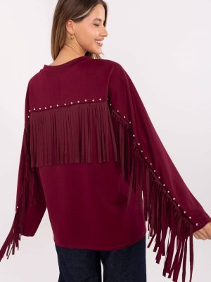 Γυναικεία μπλούζα με καζουάλ χαρακτήρα, δημιουργημένη με σκοπό τις καθημερινές στιλιστικές επιλογές. Κατασκευασμένη από συνδυασμό βισκόζης και πολυεστέρα, από ένα υλικό τύπου μαλακού, απαλού και εξαιρετικά ευχάριστου στην αφή. Η λαμπρή υφή της προσδίδει καθολικότητα, ενώ το κανονικό μήκος και ο κλασικός, στρογγυλός λαιμός την κάνουν να εφαρμόζει τέλεια στη σιλουέτα. Τα μακριά μανίκια είναι διακοσμημένα με φούντες και καρφιά, που προσθέτουν έντονο χαρακτήρα στο σύνολο. Οι φούντες υπάρχουν επίσης στην πλάτη, τονίζοντας το πρωτότυπο, μοντέρνο στυλ της μπλούζας. Είναι η ιδανική επιλογή για γυναίκες που εκτιμούν την άνεση σε συνδυασμό με τη μοντέρνα λεπτομέρεια.