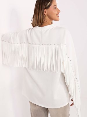 Γυναικεία μπλούζα με καζίρ χαρακτήρα, σχεδιασμένη για καθημερινές στυλιστικές επιλογές. Κατασκευασμένη από συνδυασμό βισκόζης και πολυεστέρα, από υλικό τύπου βουτύρου, μαλακό, λεπτό και εξαιρετικά ευχάριστο στην αφή. Η λεία υφή της της προσδίδει μοναδικότητα, ενώ το κανονικό μήκος και ο κλασικός, στρογγυλός λαιμός την κάνουν να εφαρμόζει τέλεια στη σιλουέτα. Τα μακριά μανίκια διακοσμούνται με φουντίτσες και καρφιά, που προσθέτουν έντονο χαρακτήρα στο σύνολο. Οι φουντίτσες εμφανίζονται επίσης στην πλάτη, υπογραμμίζοντας τον πρωτότυπο, μοντέρνο στυλ της μπλούζας. Είναι η ιδανική επιλογή για γυναίκες που εκτιμούν την άνεση σε συνδυασμό με μοντέρνες λεπτομέρειες.