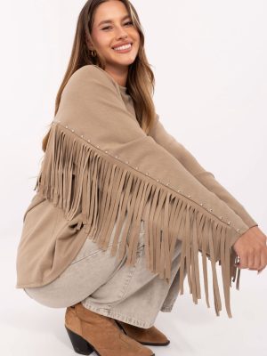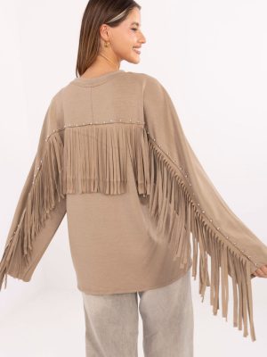 Γυναικεία μπλούζα με καζουάλ χαρακτήρα, σχεδιασμένη για καθημερινές εμφανίσεις. Κατασκευασμένη από ένα μείγμα βισκόζης και πολυεστέρα, από ύφασμα τύπου βούτυρο, μαλακό, λεπτό και εξαιρετικά ευχάριστο στην αφή. Η λεία υφή της προσδίδει πολυλειτουργικότητα, ενώ το κανονικό μήκος και ο κλασικός, στρογγυλός λαιμός την κάνουν να προσαρμόζεται τέλεια στη σιλουέτα. Τα μακριά μανίκια είναι διακοσμημένα με φούντες και τρουκς, προσθέτοντας στη συνολική εμφάνιση έναν έντονο χαρακτήρα. Οι φούντες βρίσκονται επίσης στην πλάτη, τονίζοντας το πρωτότυπο, μοντέρνο στυλ της μπλούζας. Είναι η ιδανική επιλογή για γυναίκες που εκτιμούν την άνεση συνδυασμένη με μοντέρνες λεπτομέρειες.