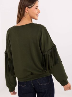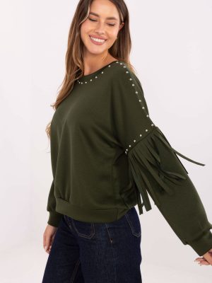 Η γυναικεία casual μπλούζα σε απλή εκδοχή είναι μια στιλάτη πρόταση για καθημερινή χρήση. Ραμμένη από μαλακό μείγμα βισκόζης και πολυεστέρα, εξασφαλίζει άνεση φόρεσης και ευκολία κατά τη διάρκεια ολόκληρης της ημέρας. Ο κλασικός, στρογγυλός λαιμός έχει διακοσμηθεί με διακριτικά καρφάκια, που προσθέτουν στη συνολική εμφάνιση έναν μοντέρνο χαρακτήρα. Το μακρύ μανίκι με εντυπωσιακές κρόσσιες και εφαρμογή καρφιών κάνει την μπλούζα να ξεχωρίζει ανάμεσα σε καθημερινές στυλιστικές επιλογές. Η τυπική μήκος και η απουσία κλεισίματος την καθιστούν πρακτικό, αλλά ταυτόχρονα μοναδικό στοιχείο της γκαρνταρόμπας.