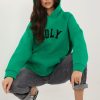 Γυναικείο πουλόβερ με μακρύ μανίκι και στρογγυλή λαιμόκοψη. Διακοσμητικά γράμματα στο μπροστινό μέρος και στα μανίκια.