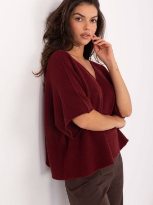 Καθημερινό γυναικείο πουλόβερ κανονικού μήκους, τέλειο για καθημερινή χρήση. Κατασκευασμένο από ευχάριστο στην αίσθηση μείγμα βισκόζης, πολυεστέρα και νάιλον, προσφέρει άνεση και ανθεκτικότητα για μεγάλο χρονικό διάστημα. Το απλό σχέδιο το καθιστά универсικό και εύκολο να συνδυαστεί με διάφορα κομμάτια ρούχων. Το μοντέλο με κοντό μανίκι και λαιμόκοψη σε σχήμα V συνδυάζει την άνεση με τη γυναικεία ελαφρότητα. Ένα ιδιαίτερο πλεονέκτημα του είναι η διπλή του πλευρά, μπορεί να φορεθεί είτε με την πλευρά που έχει ορατή ραφή εξωτερικά, είτε με την πλευρά που έχει κρυφή ραφή, δίνοντας τη δυνατότητα δημιουργίας διαφόρων, πρωτότυπων στυλιστικών συνθέσεων.