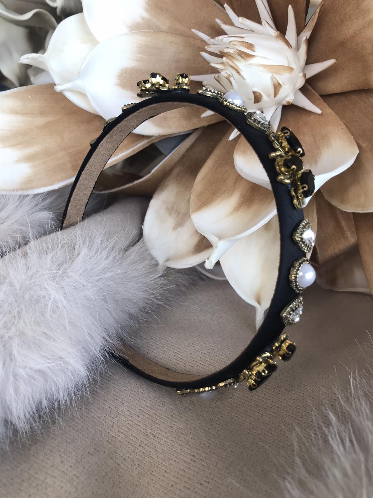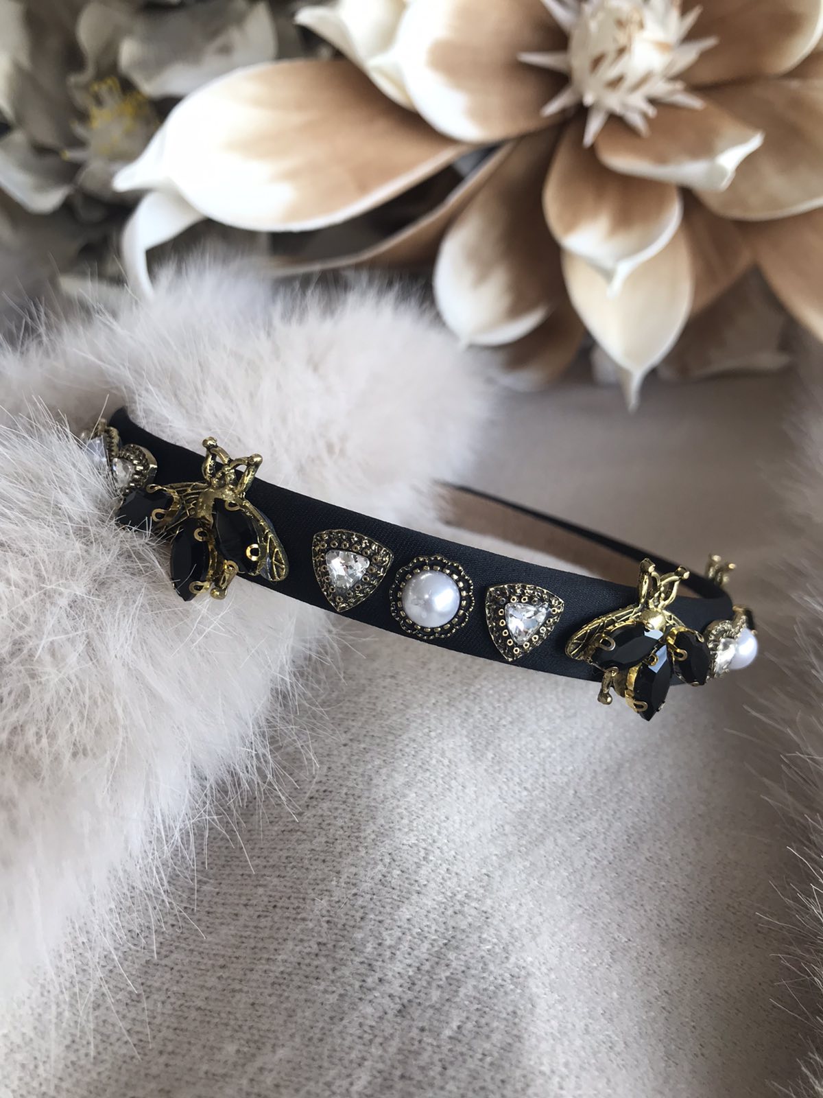Στέκα μαλλιών σε μαύρο χρώμα με λευκά και μαύρα στρας και πέρλες με μεταλλική λεπτομέρεια σε σχέδιο μέλισσας.