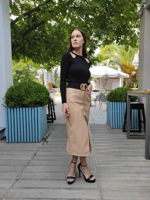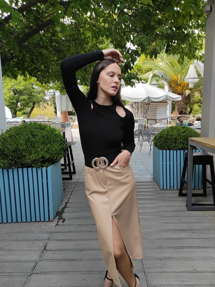 Μαύρη μπλούζα σε στενή γραμμή, ριμπ ύφανση, με μακρύ μανίκι και άνοιγμα στους ώμους.