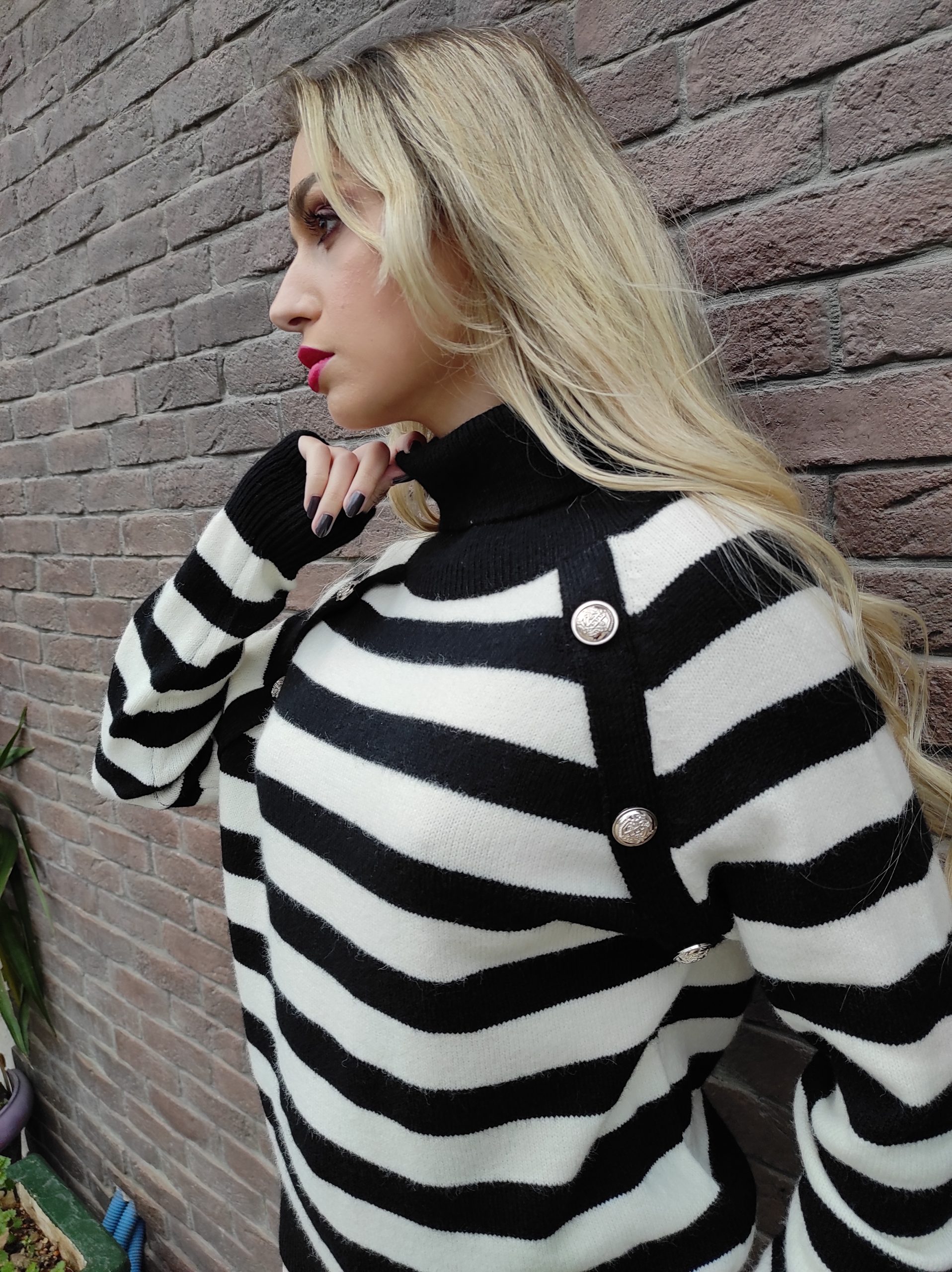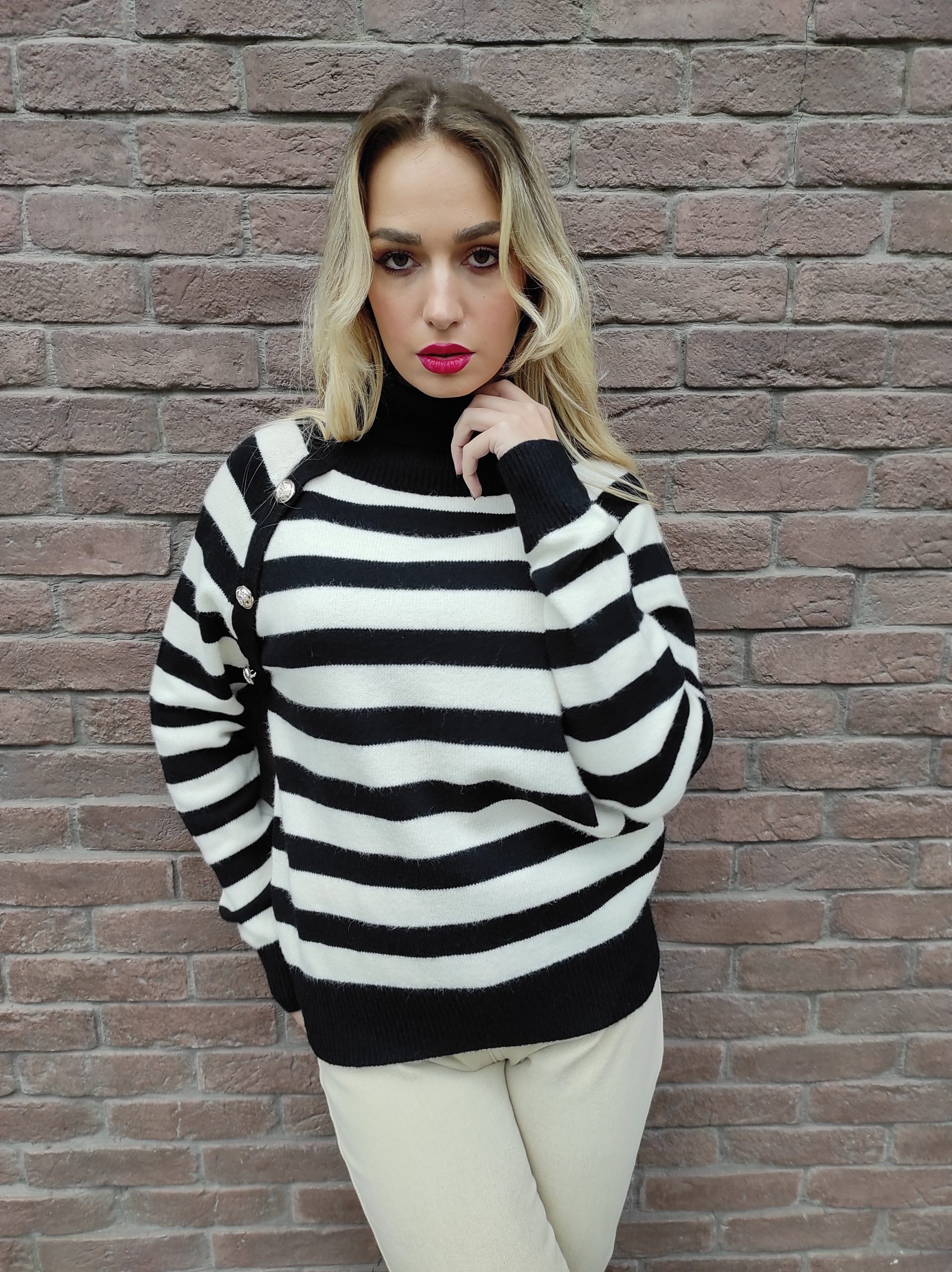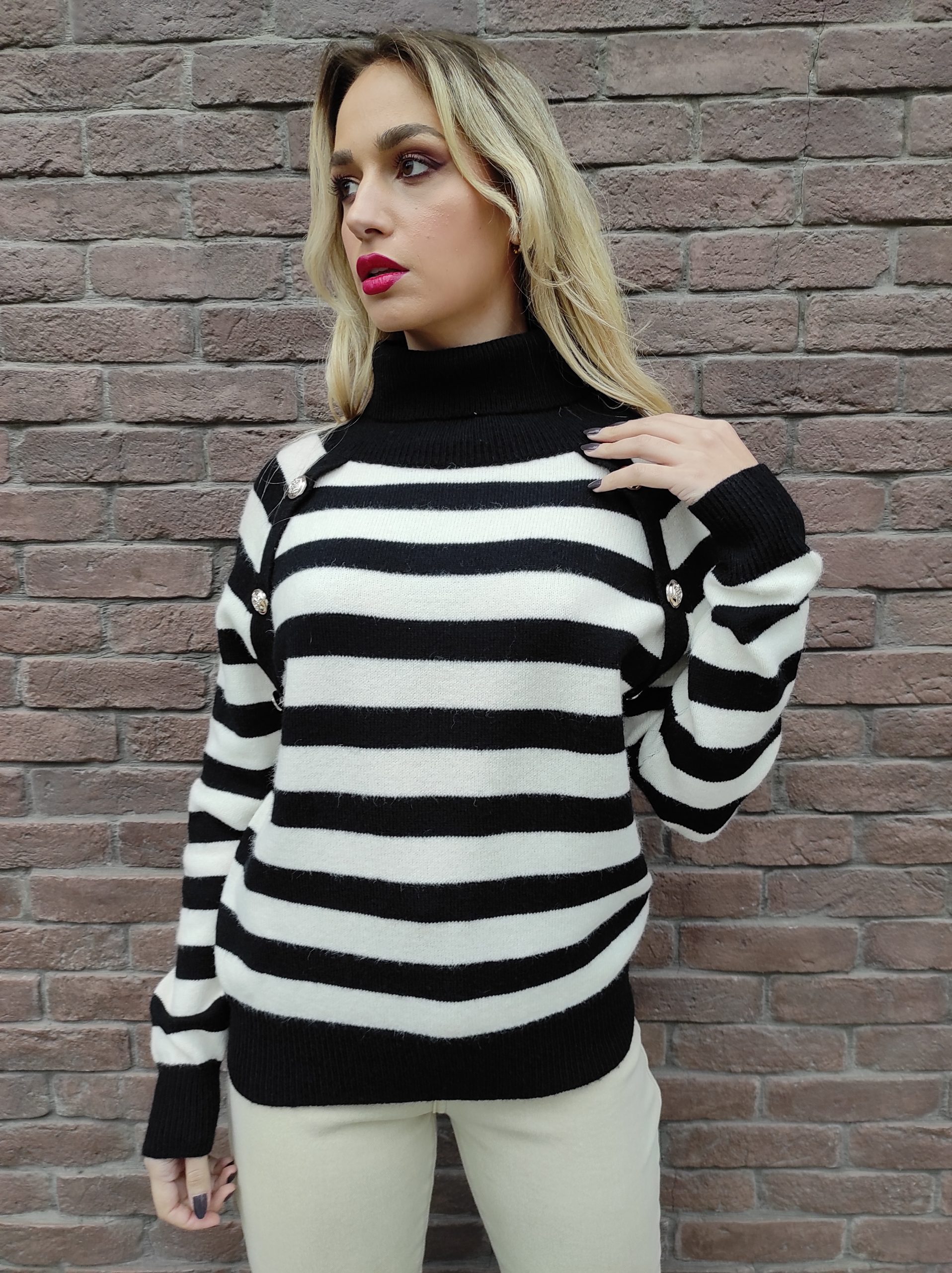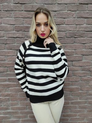 Ριγέ πλεκτή μπλούζα ζιβάγκο με σχέδιο κουμπιά, έχει μακριά μανίκια και κανονικό μήκος. Διαθέτει ελαστικότητα και καλύπτει μεγέθη από xsmall έως και xlarge. Δεν τσιμπάει.