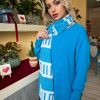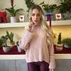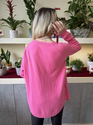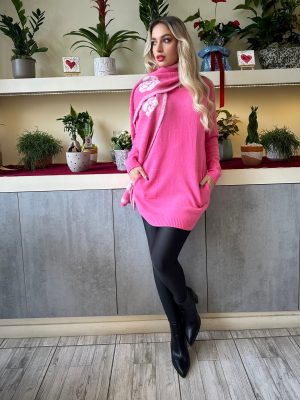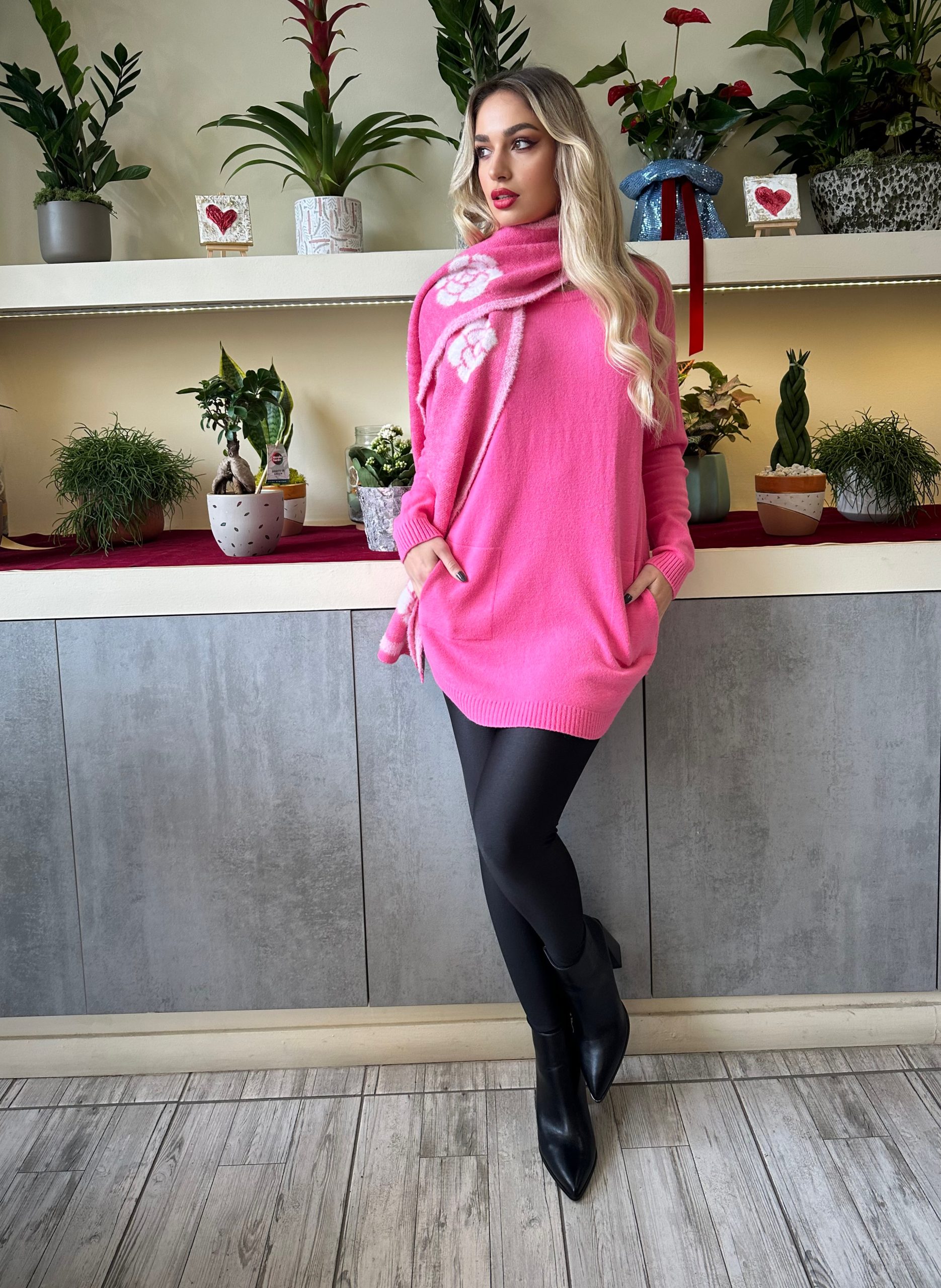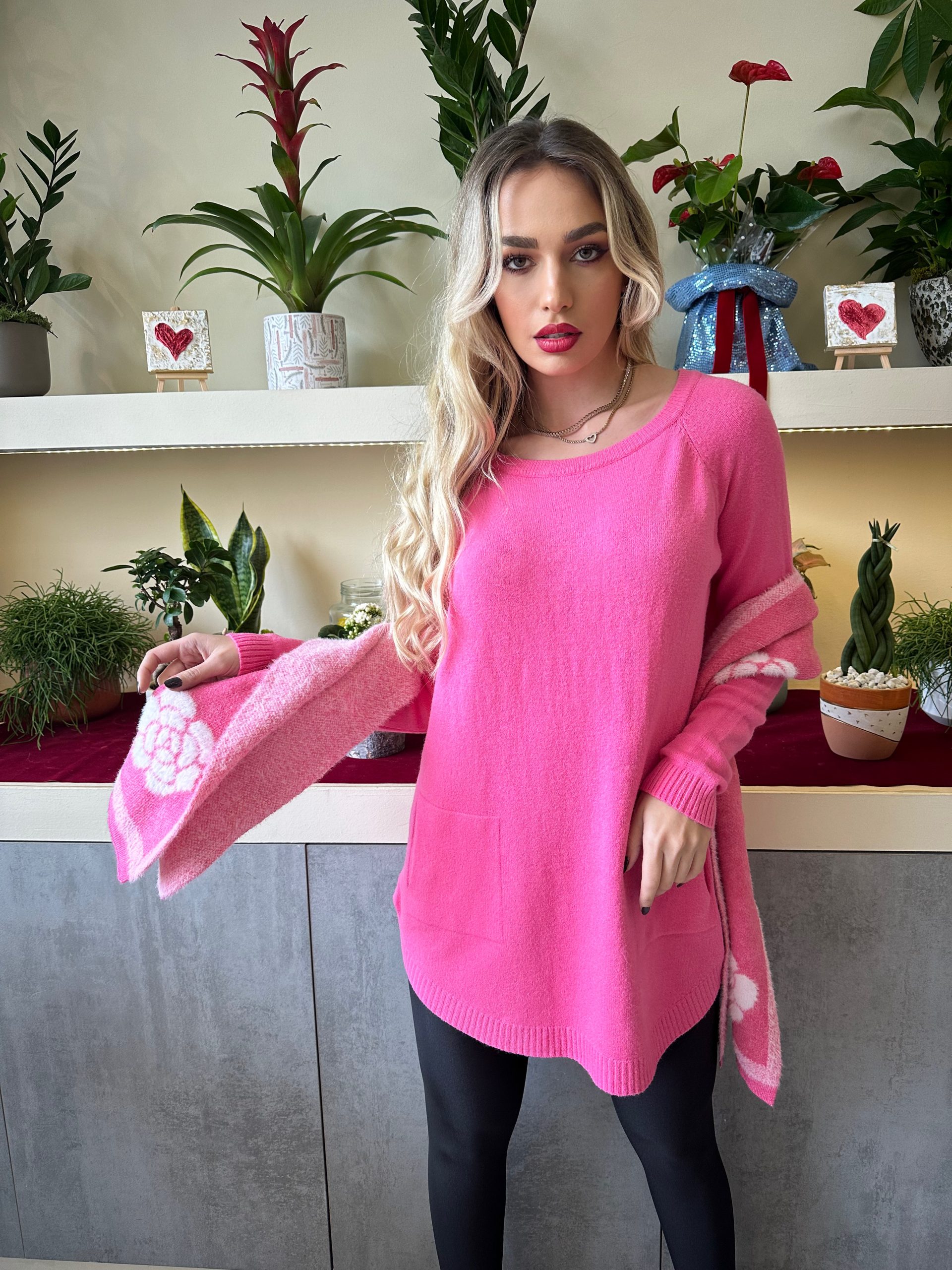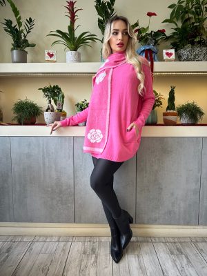 Μπλούζα πλεκτή σε ροζ χρώμα, πολύ άνετη γραμμή, με τσέπες στο μπροστινό μέρος και κουμπάκια στα πλάγια. Συμπεριλαμβάνεται κασκόλ σε ροζ χρώμα με λευκά λουλούδια. Δεν τσιμπάει. Καλύπτει μεγέθη από small έως και xxl.