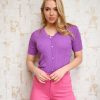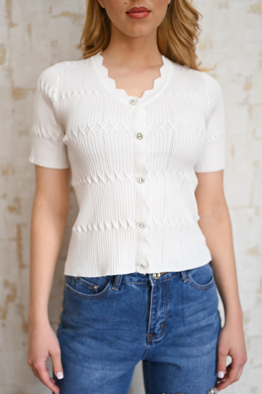 Μπλούζα ριμπ σε λευκό χρώμα, με κοντό μανίκι και διακοσμητικά κουμπιά με διαφανή πέτρες στο μπροστινό μέρος