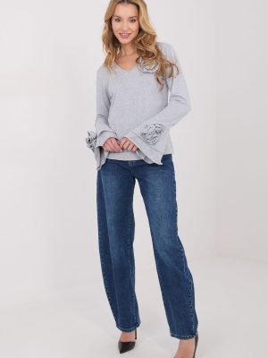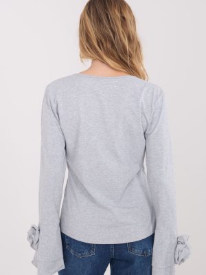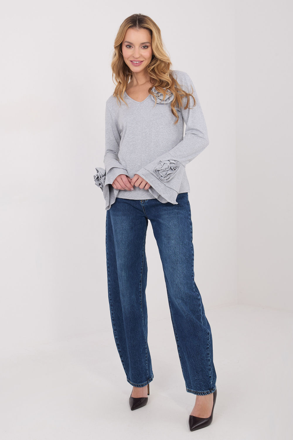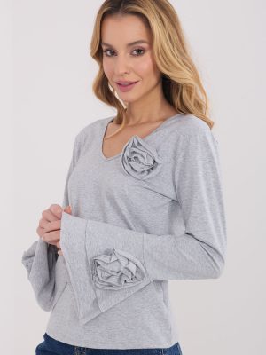 Κομψό μπλουζάκι τύπου longsleeve με στενή γραμμή, που τονίζει εντυπωσιακά τη σιλουέτα και συνδυάζει την κλασική ομορφιά με διακοσμητικές λεπτομέρειες. Φτιαγμένο από υψηλής ποιότητας βαμβάκι, προσφέρει άνεση κατά την διάρκεια της ημέρας και ευχάριστη εφαρμογή. Το μοντέλο με ομαλή υφή διαθέτει V λαιμόκοψη, που εκθέτει διακριτικά τον λαιμό και προσθέτει γυναικεία χαρακτήρα. Οι μακριές μανίκια τύπου καμπάνα προσφέρουν ελαφρότητα και κομψότητα στη συνολική εμφάνιση, ενώ οι διακοσμητικές, υφασμάτινες λουλούδια τοποθετημένα στις μανίκες και κοντά στη λαιμόκοψη αποτελούν μοναδική διακοσμητική λεπτομέρεια. Το κανονικό μήκος εξασφαλίζει ότι το μπλουζάκι είναι ιδανικό τόσο για καθημερινές εμφανίσεις, για το γραφείο, για επίσημες συναντήσεις, όσο και για κομψές εξόδους ή εκδηλώσεις.