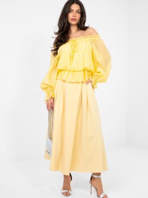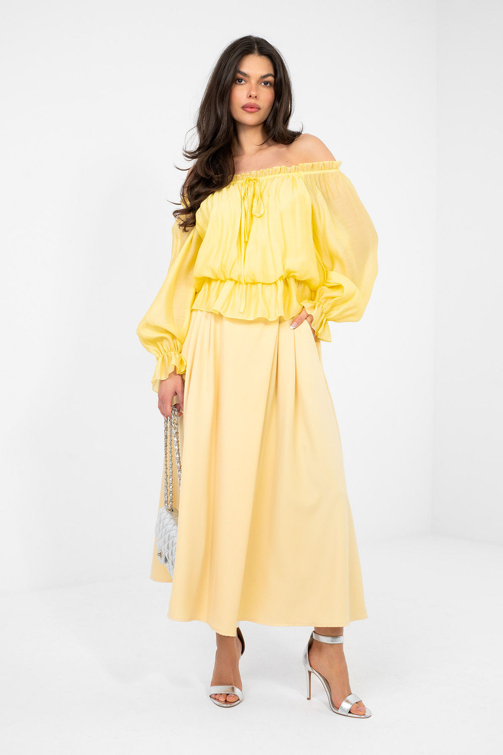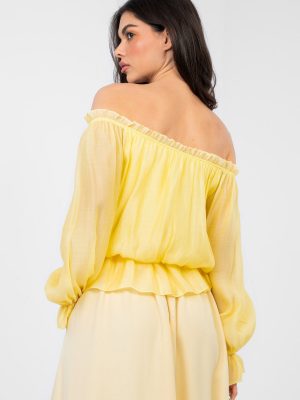 Ένα κομψό μπλουζάκι σε boho στυλ είναι ο συνδυασμός της διακριτικής θηλυκότητας και της ελεύθερης ελαφρότητας. Το λείο σχέδιο υπογραμμίζει τον καθολικό χαρακτήρα του, καθιστώντας το ιδανικό τόσο για καθημερινή χρήση, όσο και για εργασία, καθώς και για πιο επίσημες περιστάσεις. Κατασκευασμένο από ένα μείγμα λυοσελίνης και πολυεστέρα, εντυπωσιάζει με την απαλότητα, την ελαφρότητα και τη λεπτή ρέουσα δομή του υφάσματος. Το ύφασμα αγκαλιάζει όμορφα τη σιλουέτα, προσφέροντας άνεση καθ’ όλη τη διάρκεια της ημέρας. Το μπλουζάκι διαθέτει επένδυση στο κεντρικό μέρος, γεγονός που αυξάνει την άνεση και βελτιώνει την αισθητική της φινέτσας. Το μοντέλο με ντεκολτέ τύπου ισπανικού εκθέτει εξαιρετικά τους ώμους, προσδίδοντας ρομαντικό χαρακτήρα στην εμφάνιση. Το μακρύ μανίκι που καταλήγει σε βολάν προσθέτει ελαφρότητα και υπογραμμίζει την boho ατμόσφαιρα. Επιπλέον πλεονέκτημα είναι το δέσιμο μπροστά, το οποίο αποτελεί μία διακριτική, διακοσμητική πινελιά, ενώ το βολάν στο κάτω μέρος προσφέρει μια αίσθηση ρευστότητας και θηλυκής γοητείας. Είναι μια μοναδική πρόταση για γυναίκες που εκτιμούν την κομψότητα με μία δόση αψυχολόγητου και θέλουν να δείχνουν στυλάτες σε κάθε περίσταση.