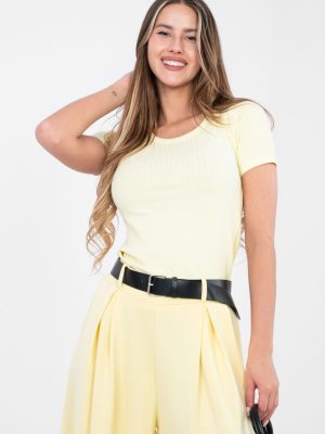 Ένα εφαρμοστό μπλουζάκι με καζουάλ χαρακτήρα είναι η τέλεια βάση για καθημερινές στυλιστικές επιλογές. Φτιαγμένο από υψηλής ποιότητας μείγμα βαμβακιού και ελαστάνης, εξασφαλίζει άνεση κατά την φορεσιά, ελαστικότητα και ιδανική προσαρμογή στη σιλουέτα. Το υλικό είναι μαλακό, ευχάριστο για το δέρμα και έχει όμορφη πτώση στο σώμα. Το μοντέλο έχει κανονικό μήκος, κοντά μανίκια και κλασικό, στρογγυλό λαιμό, κάνοντάς το εξαιρετικά ευέλικτο και διαχρονικό. Το απλό σχέδιο τονίζει τον μινιμαλιστικό στυλ, ενώ η ριχτή υφή του υλικού προσθέτει μια λεπτή υφή και μοντέρνα φινέτσα. Το μπλουζάκι δεν διαθέτει κλείσιμο, γεγονός που το καθιστά άνετο και εύκολο στην εφαρμογή. Ιδανικό για καθημερινή χρήση, είτε σε συνδυασμό με τζιν, σορτς, είτε με φούστα, δημιουργώντας άνετα και στυλάτα σύνολα.