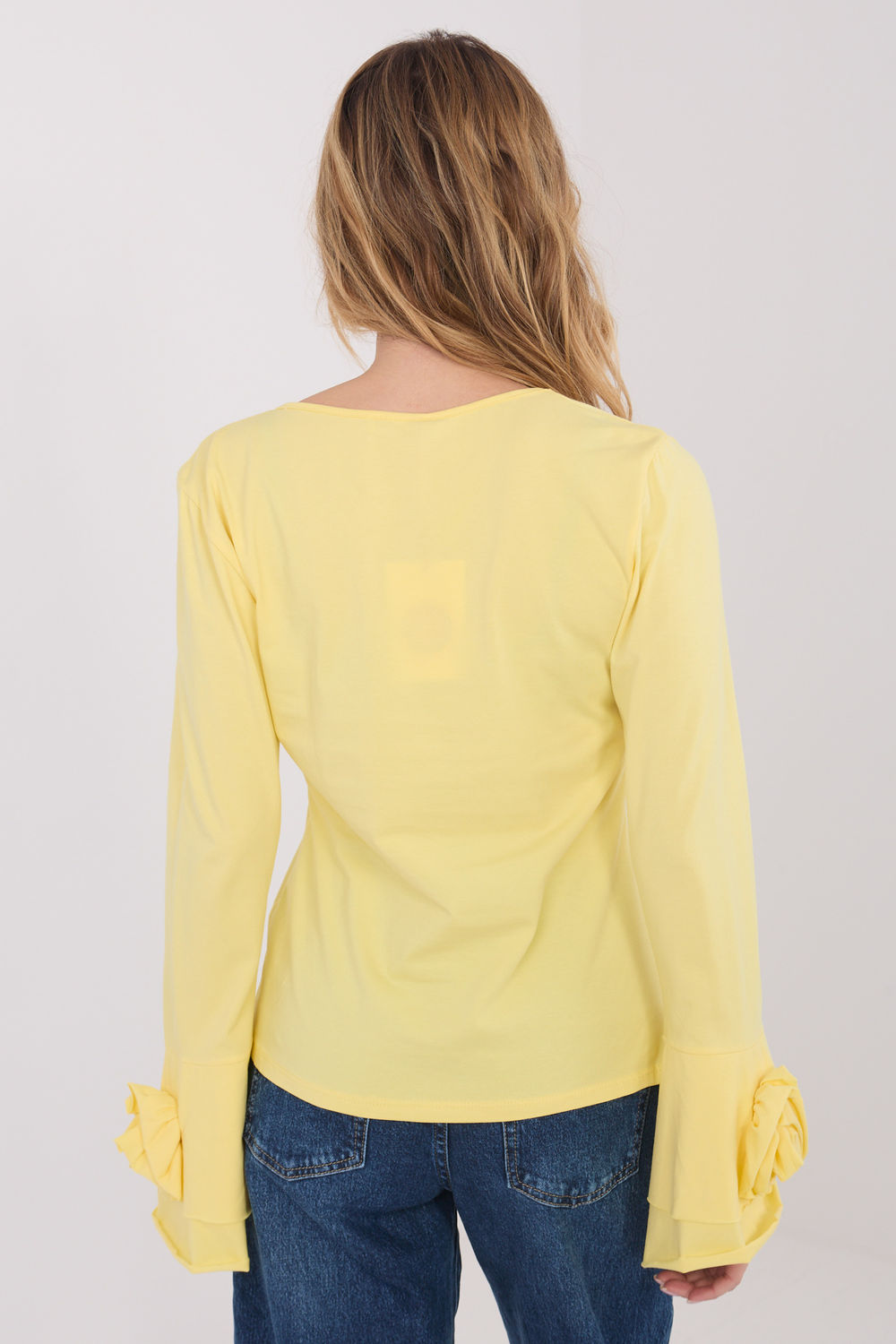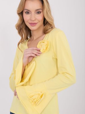 Μια κομψή μπλούζα τύπου longsleeve με στενή εφαρμογή, που εντυπωσιακά τονίζει τη σιλουέτα και συνδυάζει την κλασική γραμμή με διακοσμητικές λεπτομέρειες. Κατασκευασμένη από υψηλής ποιότητας βαμβάκι, παρέχει άνεση κατά τη διάρκεια της ημέρας και ευχάριστη εφαρμογή. Το μοντέλο με απλή σχέδιο διαθέτει ντεκολτέ σε σχήμα V, που υπογραμμίζει διακριτικά τον λαιμό και προσθέτει θηλυκό χαρακτήρα. Τα μακριά μανίκια τύπου καμπάνα προσδίδουν ελαφρότητα και κομψότητα, ενώ οι διακοσμητικές, υφασμάτινες ανθοδέσμες τοποθετημένες στα μανίκια και γύρω από το ντεκολτέ αποτελούν μια μοναδική διακοσμητική έμφαση. Η κανονική του μήκος καθιστά τη μπλούζα ιδανική τόσο για καθημερινές εμφανίσεις στη δουλειά και σε επαγγελματικές συναντήσεις, όσο και για κομψές εξόδους ή εκδηλώσεις.